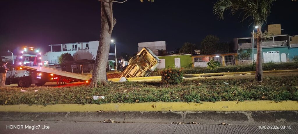 Tapachula, Chiapas, 10 de febrero de 2026.— Una camioneta terminó prácticamente destruida tras salirse del camino y caer a un dren pluvial en el par vial de la Novena Avenida Sur, a la altura de la calle Lirios y el bulevar Internado número 11. Pese a la magnitud del percance, el conductor logró sobrevivir, resultando con lesiones menores.