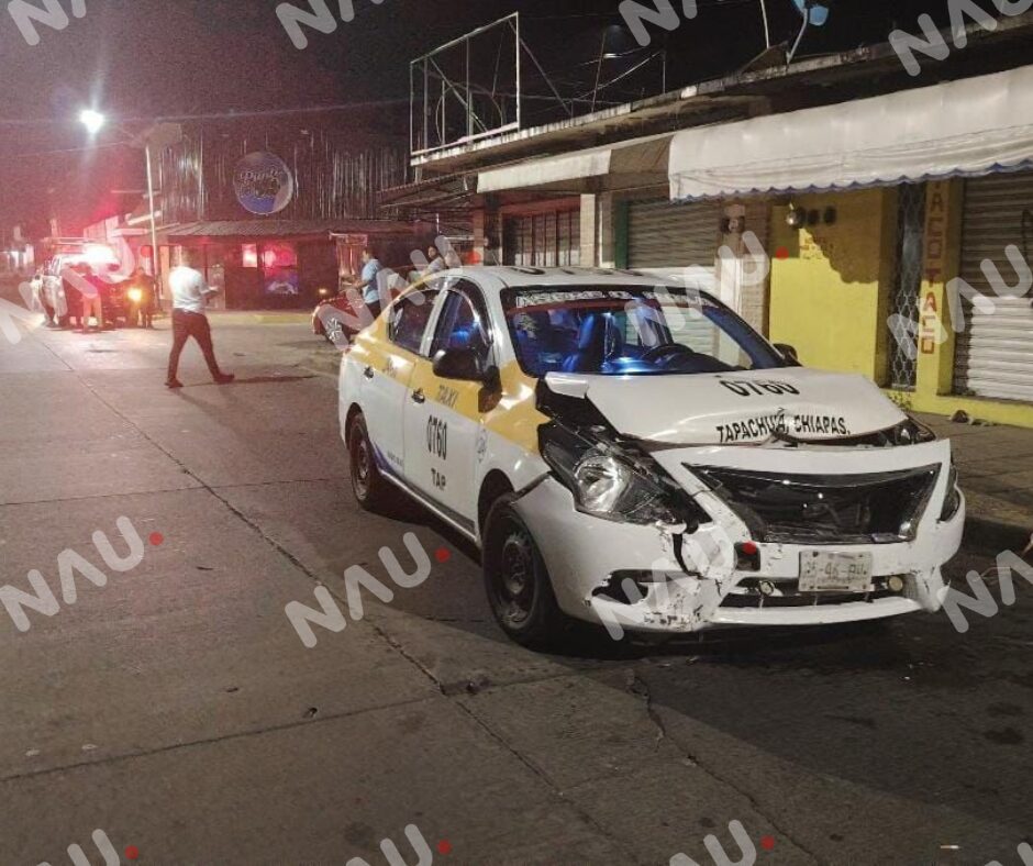 Tapachula, Chiapas; 14 de marzo de 2026.— Un accidente vehicular entre un taxi y un automóvil particular se registró durante la madrugada de este sábado en una de las vialidades más transitadas del centro de la ciudad, dejando como saldo únicamente daños materiales.