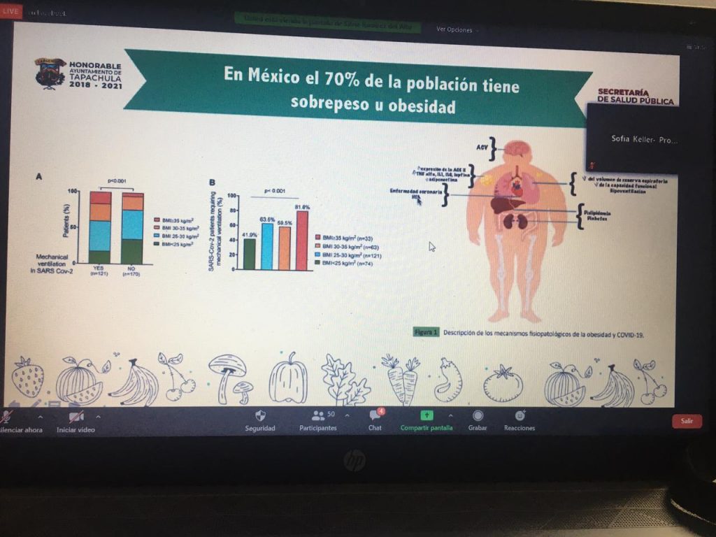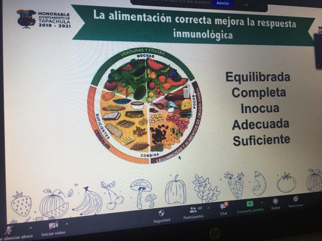 A través de las páginas oficiales Gobierno de Tapachula y Nueva normalidad, se desarrolló la conferencia virtual donde se informó que llevar una alimentación balanceada rica en frutas, vegetales, carbohidratos y cereales es fundamental para disminuir las consecuencias de cualquier enfermedad entre ellas el Covid-19.