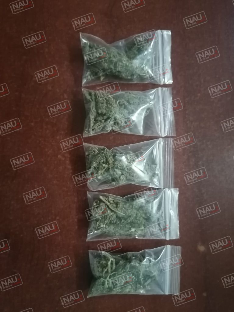 Al aplicarle una revisión corporal, se dio a conocer que a la persona se la encontró en la bolsa delantera del pantalón cinco bolsitas de nylon transparente con hierba seca con características a la marihuana, además de cuatro celulares.