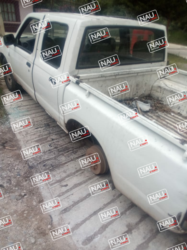 En el lugar localizaron una camioneta pick Up color blanco, sin placas de circulación, propiedad del ayuntamiento municipal y que estaba estacionado frente al DIF municipal, la cual fue destrozada, le quedaron cristales y le quitaron las llantas.