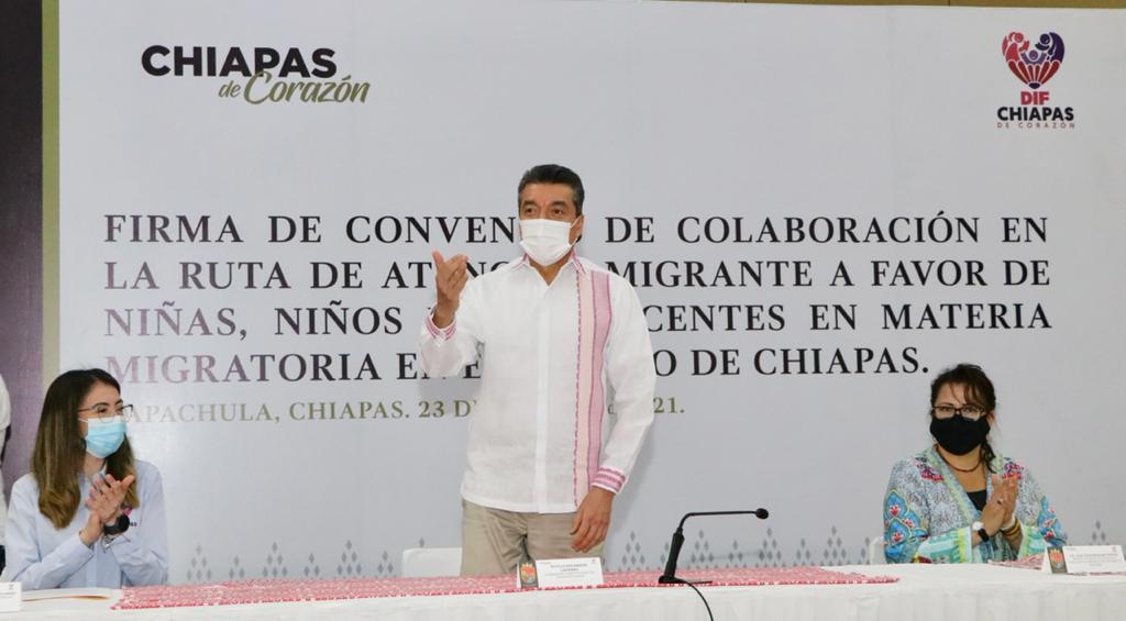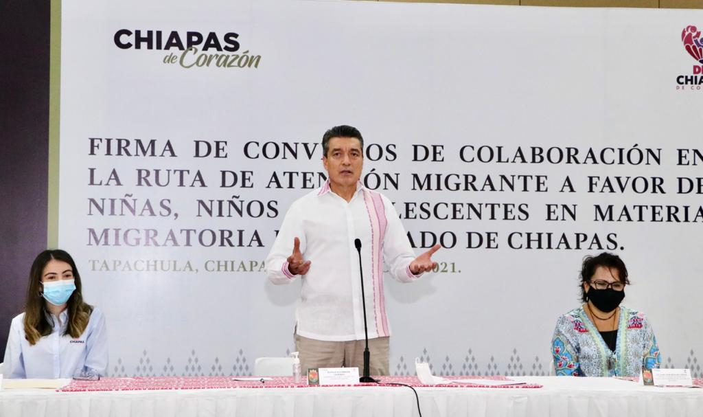 En el marco de la firma de convenios de colaboración en la Ruta de Atención Migrante a favor de Niñas, Niños y Adolescentes en materia migratoria, en el municipio de Tapachula, el gobernador Rutilio Escandón Cadenas destacó que este acuerdo demuestra la solidaridad y voluntad de trabajar como un solo ente, para velar por el respeto y protección de los derechos humanos, la dignidad y la vida de las personas, especialmente de este sector vulnerable ante este fenómeno social.