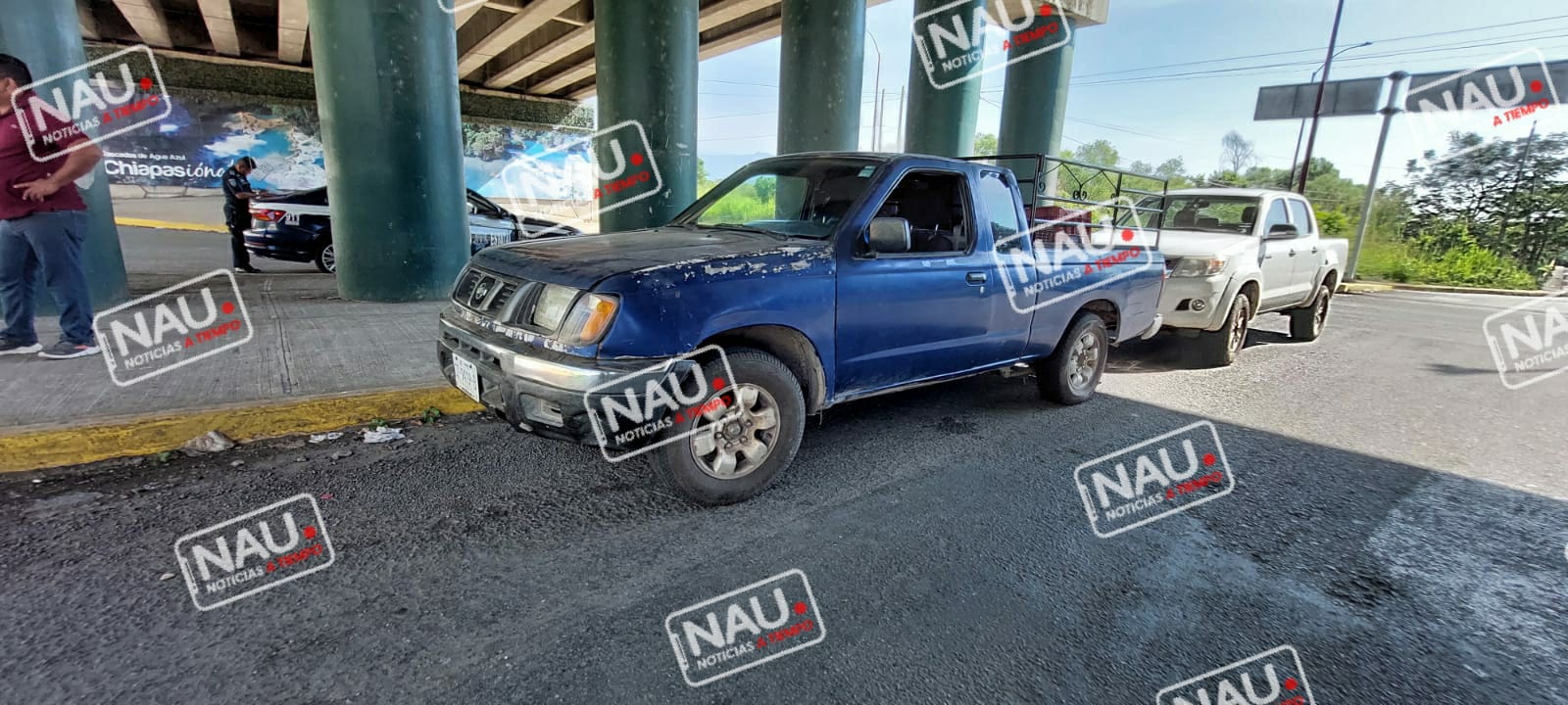 Pero al dar vuelta muy cerrada, terminó trayendo en la parte de la Defensa de una camioneta Nissan frontier de color azul, el cual venía de oriente a poniente sobre la central calle poniente.