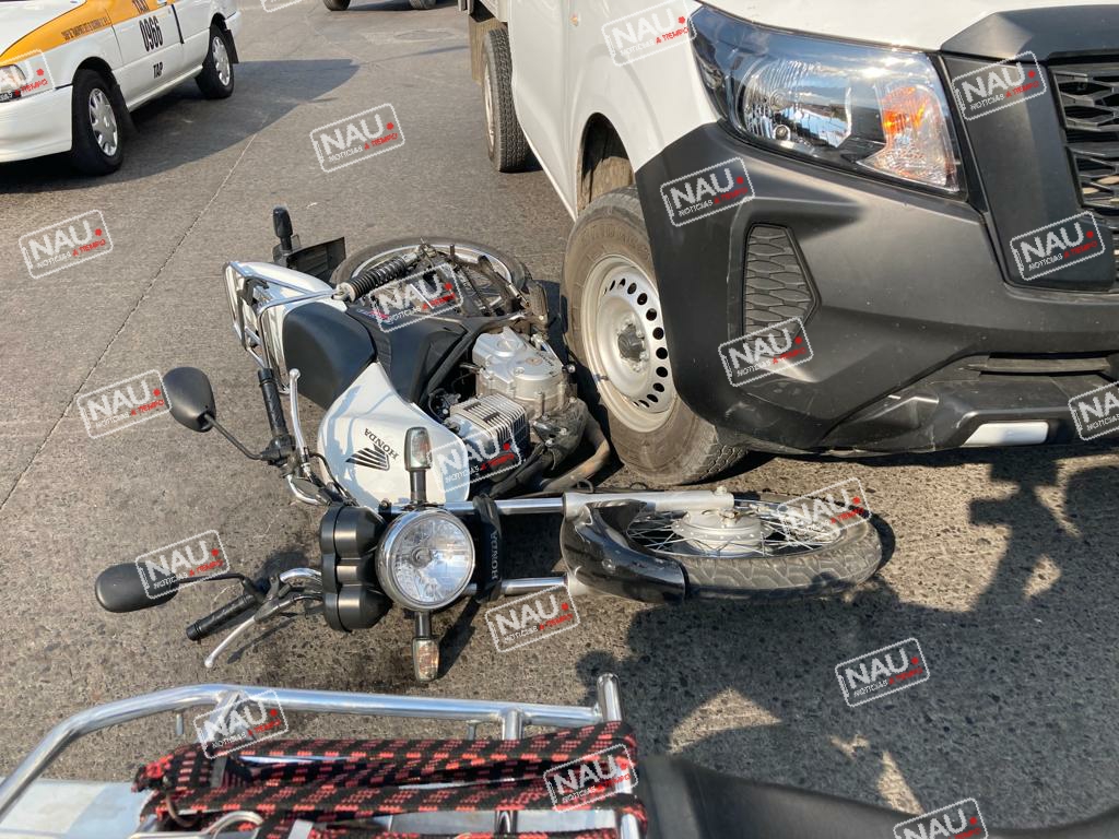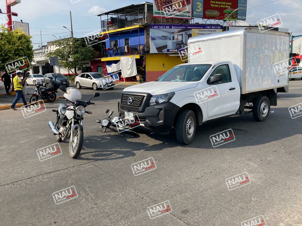 TAPACHULA, CHIAPAS. Un accidente que se registró en la séptima avenida sur y 28 calle Oriente, dejó como saldo una persona levemente lesionada conductor de una motocicleta que fue impactado por un vehículo Nissan con caja seca con placas del estado de Chiapas.