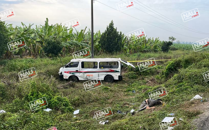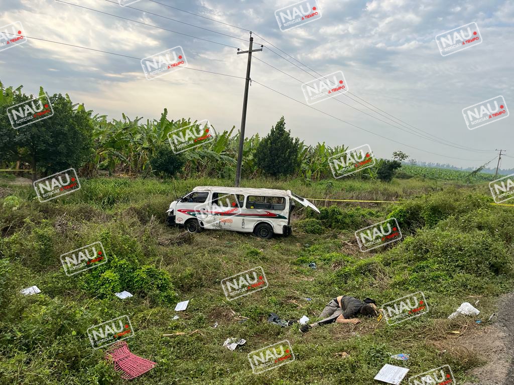 Elementos de las diferentes corporaciones policiacas arribaron al lugar, donde localizaron fuera de la cinta asfáltica, una combi de pasaje de color blanco con líneas rojas marca Nissan Urvan sin placas con número de permiso sct 600 4256 en su modalidad de transporte público de la empresa Miguel Hidalgo.