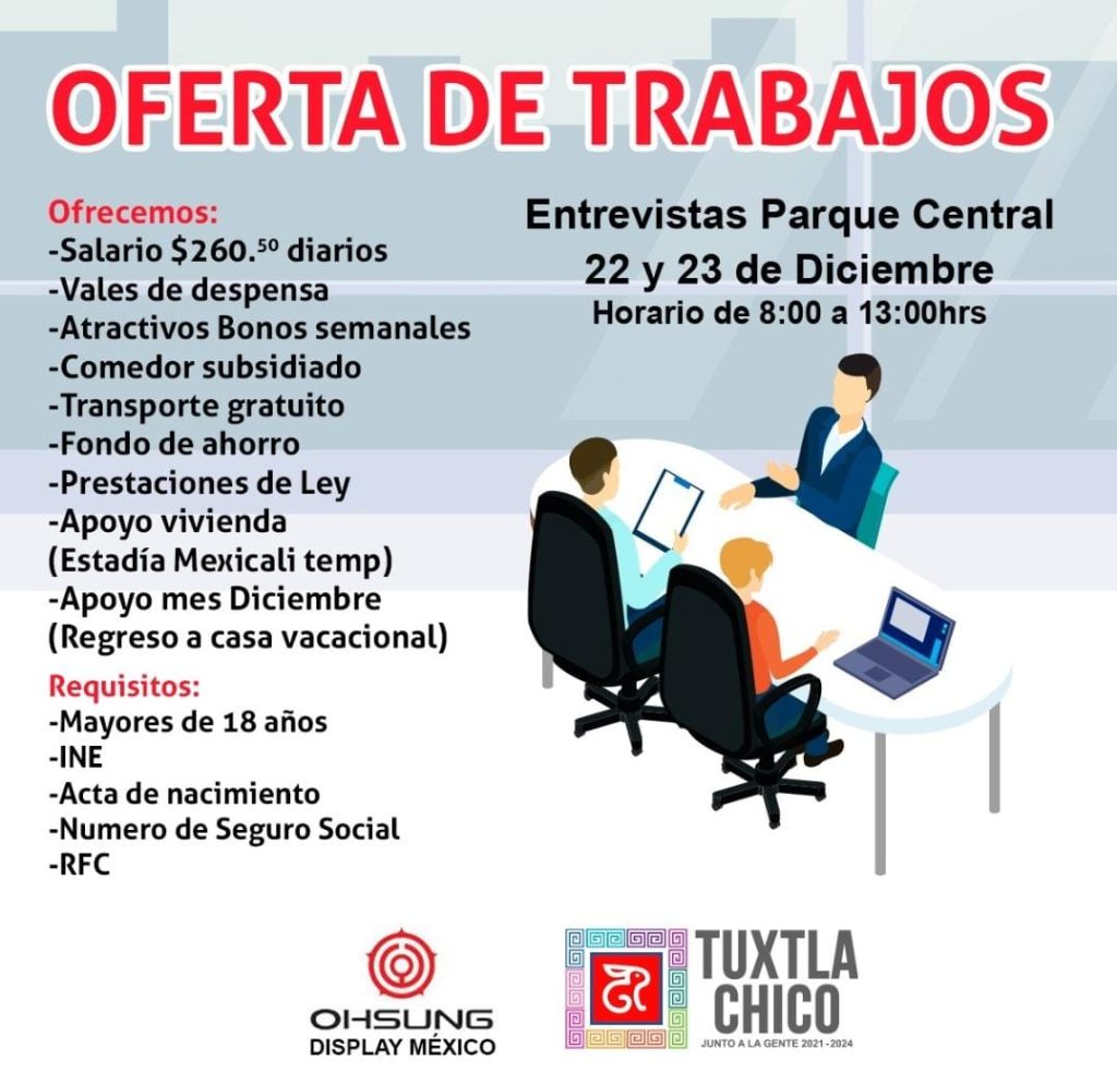 Será desde este 22 y hasta el 23 de diciembre cuando la compañía OHSUNG Display México oferte 60 vacantes de empleo, los interesados pueden acudir al parque central “Miguel Hidalgo” en un horario de 8:00 am a 1:00 pm con la siguiente documentación: INE, comprobante de domicilio, número de seguro social y RFC.