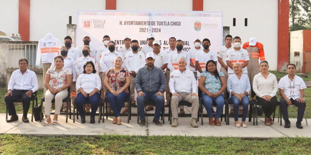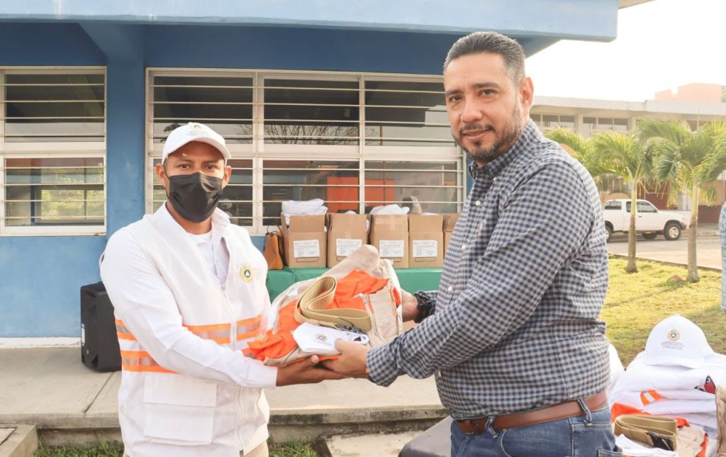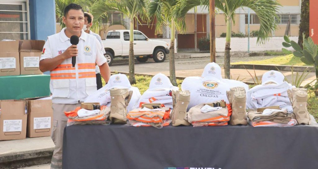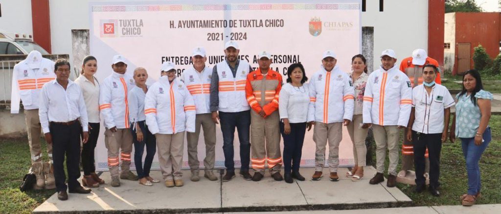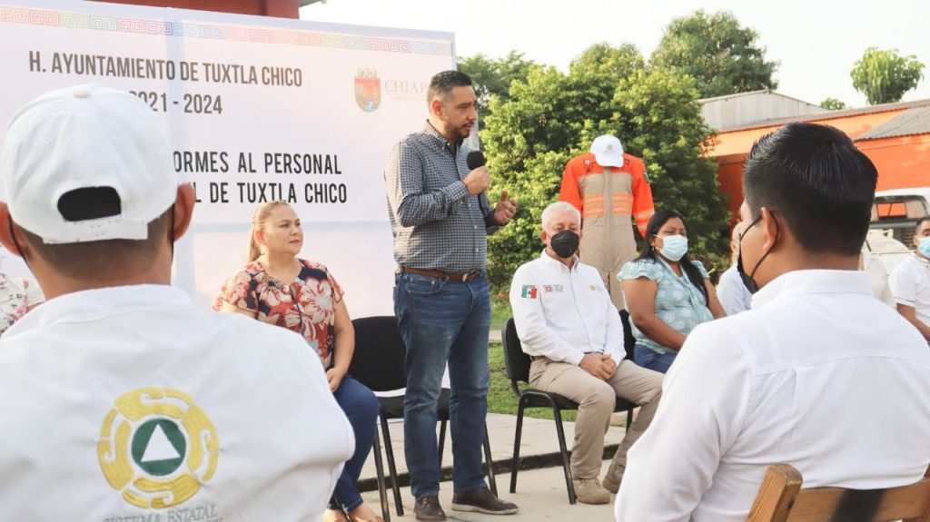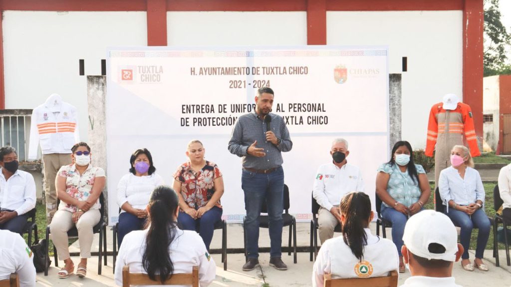 Tuxtla Chico, Chiapas a 13 de abril de 2022. Con la finalidad de mejorar sus condiciones laborales, el presidente de Tuxtla Chico, Julio Enrique Gamboa Altúzar entregó kits de uniformes a personal de Protección Civil (PC).