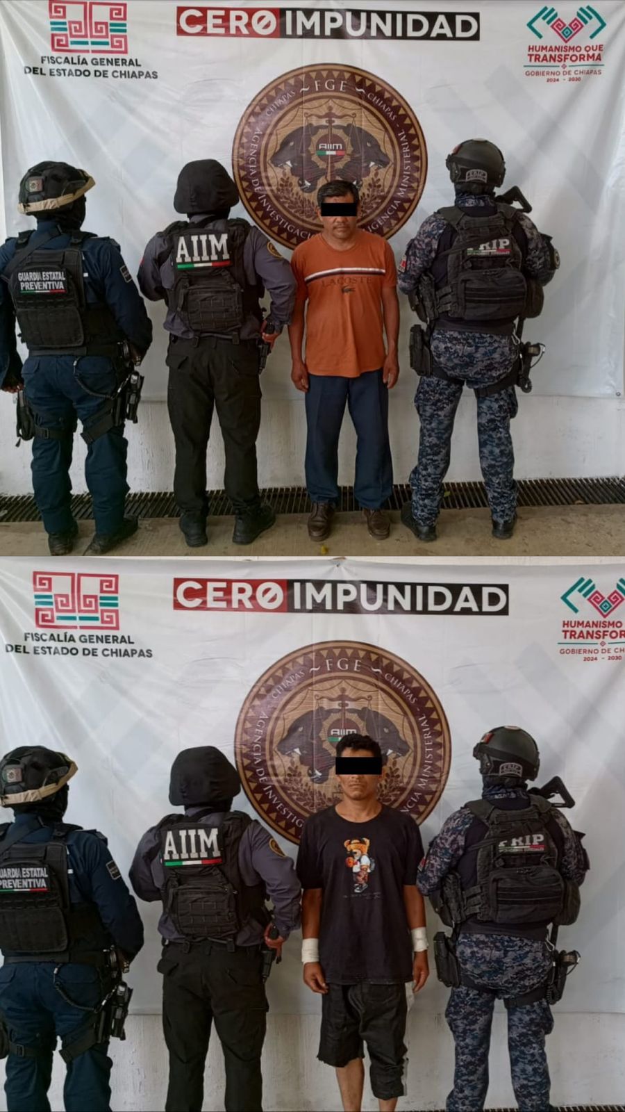La Fiscalía General del Estado y la Secretaría de Seguridad del Pueblo ejecutaron dos mandamientos judiciales en contra de Gabriel “N” y Gamaliel “N”, como presuntos responsables del delito de homicidio calificado, cometido en agravio de quien en vida respondiera al nombre de Maximino “N”, por hechos ocurridos el 11 de abril de 2026, en el ejido Nueva Sonora del municipio de Tuzantán.