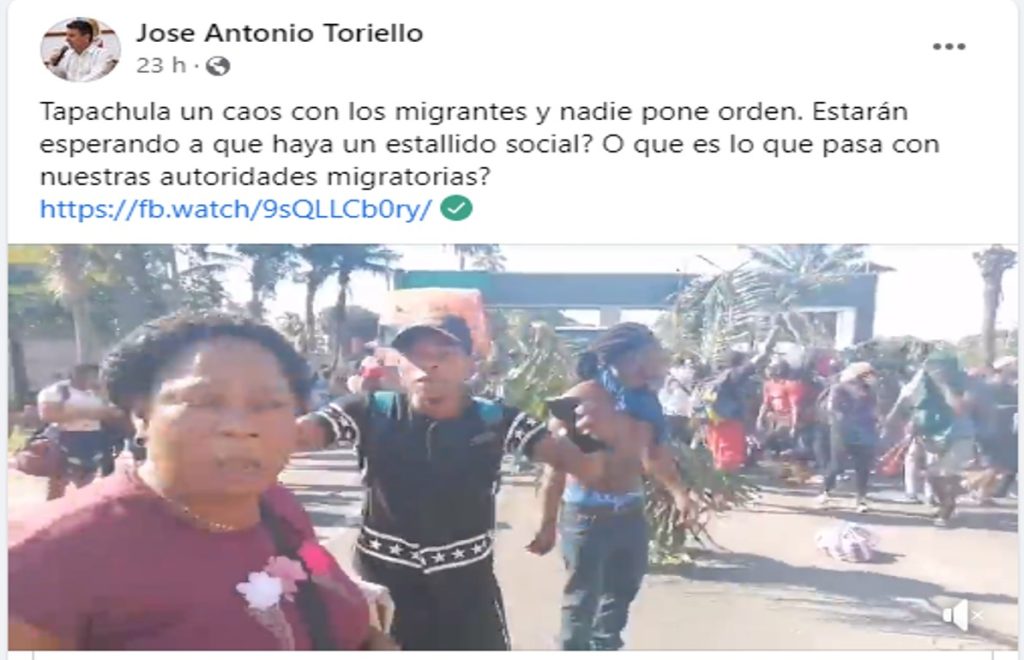 Por su parte el empresario José Antonio Toriello, lamentó el caos que provocaron los migrantes y pidió a las autoridades reaccionar de inmediato, antes de que la situación se torne trágica, “Tapachula un caos con los migrantes y nadie pone orden. Estarán esperando a que haya un estallido social? O que es lo que pasa con nuestras autoridades migratorias?”, externó a través de su cuenta de Facebook.