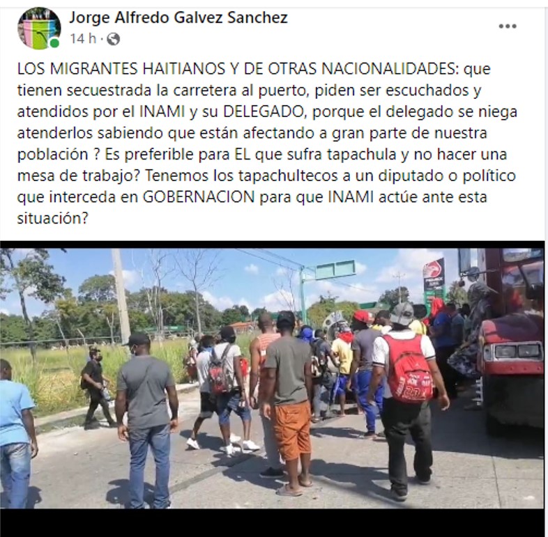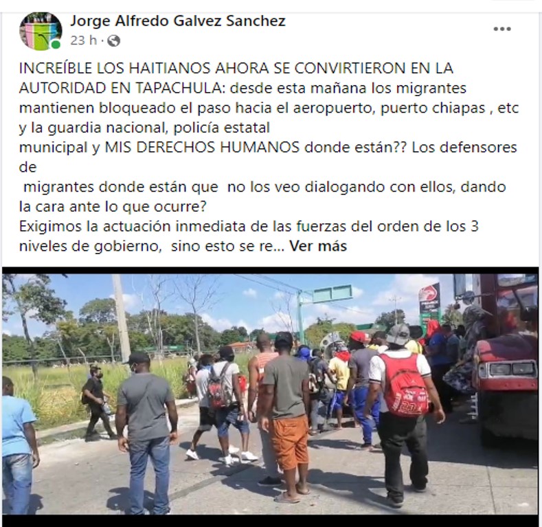 Al respecto Jorge Alfredo Gálvez Sánchez, de la Agencia Vuela, señaló en su cuenta de Facebook que es “Increíble como los haitianos ahora se convirtieron en la autoridad en Tapachula: desde esta mañana los migrantes mantienen bloqueado el paso hacia el aeropuerto, Puerto Chiapas”, por lo que se pregunta hasta cuándo van actuar la Guardia Nacional, Policía Estatal y la Policía Municipal, para hacer respetar los Derechos Humanos de los Tapachultecos.