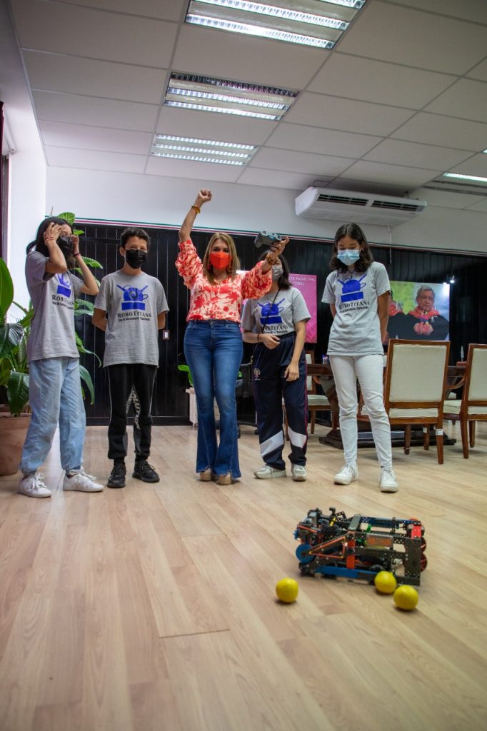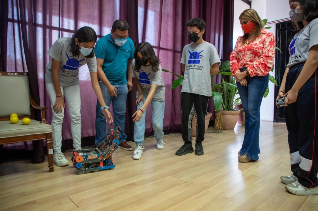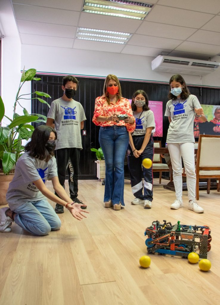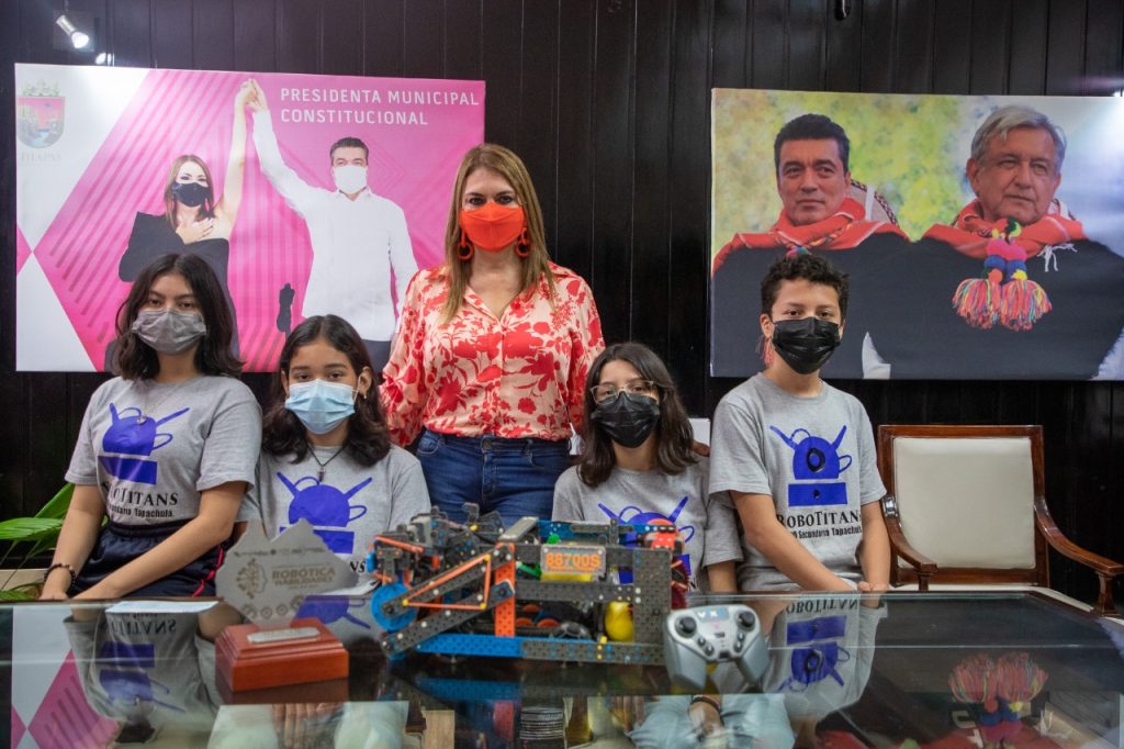 Tapachula, Chiapas.- Luego de haberlos acompañado al Campeonato Nacional de Robótica celebrado el pasado mes de marzo en Tuxtla Gutiérrez donde obtuvieron el pase para participar en el torneo a celebrarse en Dallas, Texas, la presidenta municipal de Tapachula, Rosa Irene Urbina Castañeda entregó este viernes un apoyo económico a los integrantes del club #Robotitans, quienes participarán en la contienda internacional en el mes de mayo.