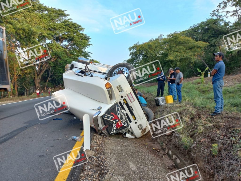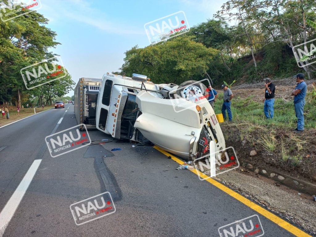 Mapastepec, Chiapas 29 de abril del 2022. Un tráiler que era manejado en dirección a Ciudad Hidalgo, Chiapas, se volcó en horas de la mañana de este viernes en la carretera Costera del Pacífico, en el tramo Mapastepec – Pijijiapan, a la altura del ejido Valdivia.