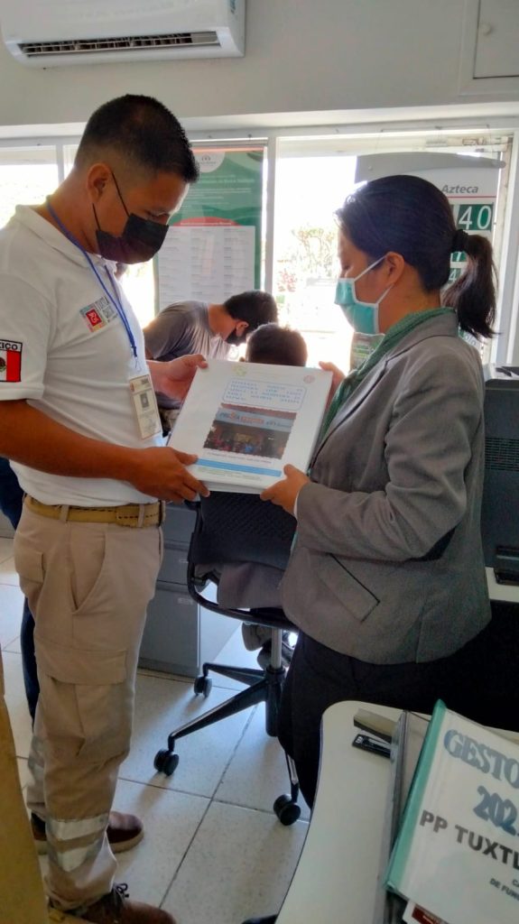 Desde la mañana de este jueves, elementos de la dirección de Protección Civil (PC) realizaron la entrega de recomendaciones en materia de Protección Civil y seguimiento al protocolo COVID – 19 a locatarios y población en general en las instalaciones del mercado de Tuxtla Chico.