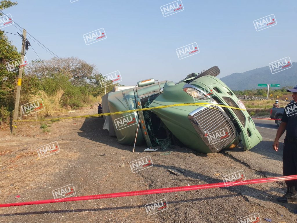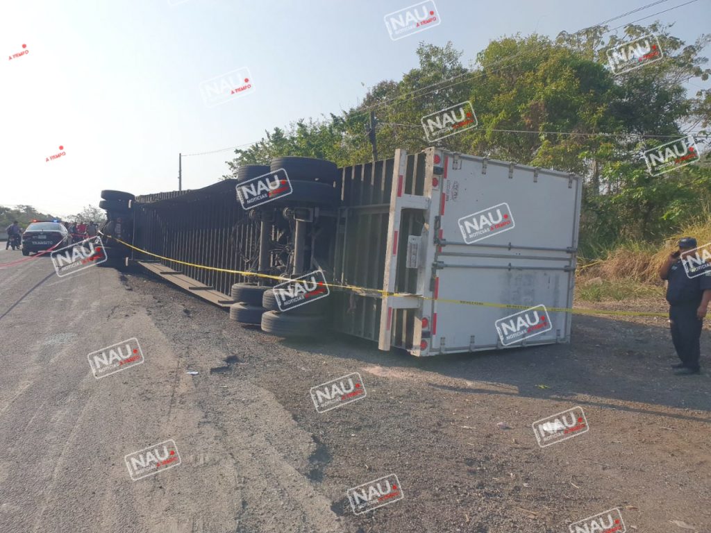 El conductor de un tráiler perdí el control del volante y terminó volcado sobre la carretera Huixtla – Tapachula la altura de La curva del Diablo.