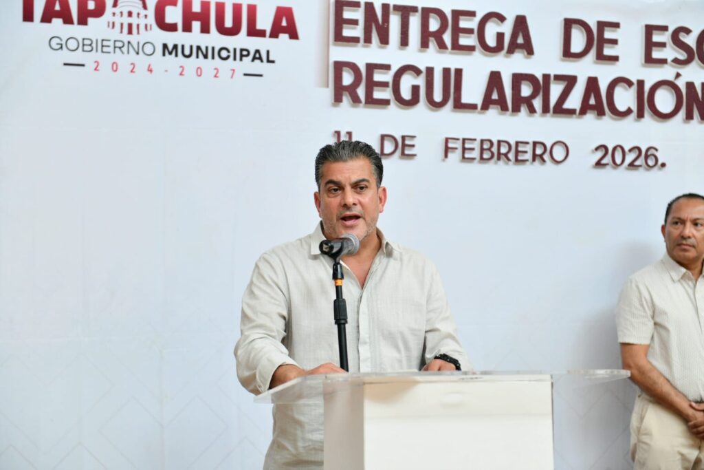 11 de febrero 2026, Tapachula, Chiapas.- Treinta y dos familias de once colonias de Tapachula, recibieron este día las escrituras de su propiedad con lo que se garantiza certeza jurídica y patrimonial, además de seguridad de un futuro mejor, destacó el presidente municipal, Yamil Melgar Bravo al presidir la entrega como parte del Programa de Regularización de la Tenencia de la Tierra.