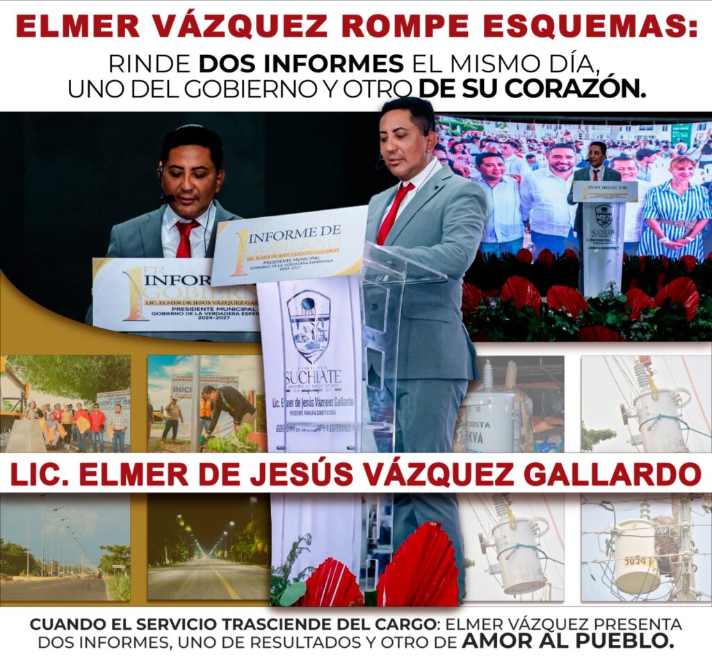 Suchiate, Chiapas. — En un hecho sin precedentes, el presidente municipal Lic. Elmer de Jesús Vázquez Gallardo rindió cuentas a su pueblo con dos informes en un mismo día, demostrando no solo los resultados de su gobierno, sino también su profundo compromiso personal con las familias suchiatenses.