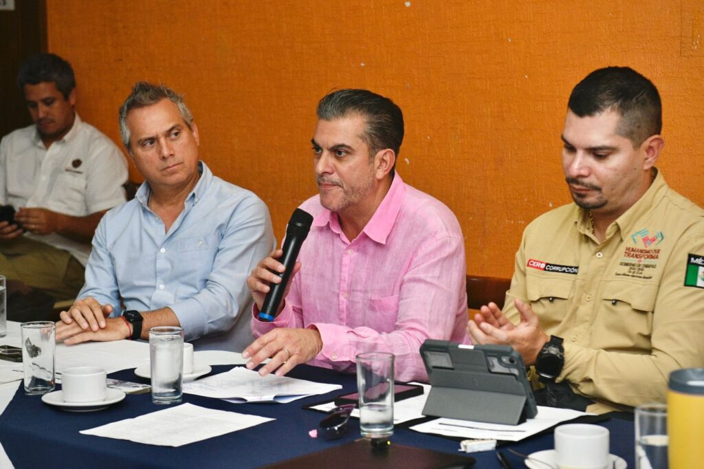 Tapachula, Chiapas.– Con el objetivo de reforzar la seguridad y mantener la paz social, empresarios y representantes de los sectores productivos sostuvieron una reunión de trabajo con el Secretario de Seguridad del Pueblo, Dr. Óscar Alberto Aparicio Avendaño, el presidente municipal de Tapachula, Yamil Melgar Bravo, y el Comisario de Seguridad Pública Municipal, Dr. Manuel Alejandro Lluch Cruz.