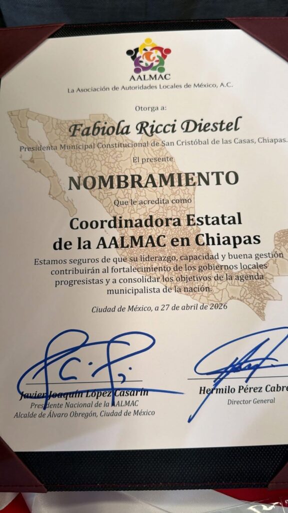 En el marco de esta asamblea, Fabiola Ricci fue designada como Coordinadora Estatal de la AALMAC en Chiapas, una responsabilidad que la coloca como enlace entre los gobiernos municipales de la entidad y esta organización de carácter nacional. Este nombramiento destaca su papel dentro del fortalecimiento del municipalismo en el estado y su participación activa en la agenda política local y nacional.