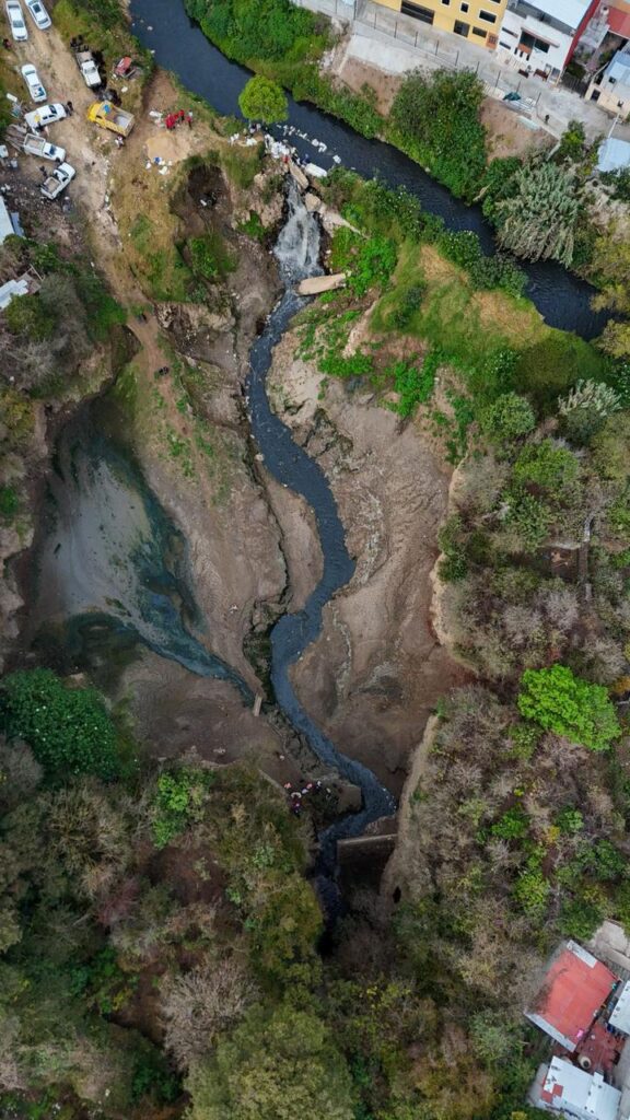 El director de Obras Públicas, Alexis Armando Coronel Espinoza, explicó que se realiza el desvío temporal del caudal del Río Amarillo y su unión con el Río Fogótico, a fin de mantener el sumidero en condiciones de “sequía operativa” y permitir el ingreso seguro del personal para retirar los sedimentos acumulados.