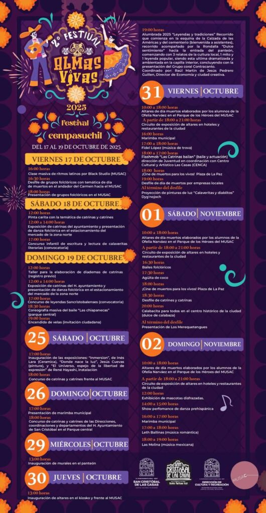 El programa contempla más de 20 actividades gratuitas, entre ellas el Concurso de Catrinas y Catrines, Leyendas Sancristobalenses, la Coreografía Masiva “Las Chiapanecas”, el Desfile de Día de Muertos, así como exposiciones de altares, música en vivo, cine al aire libre y presentaciones de danza. “Queremos que las familias y visitantes vivan nuestras tradiciones con alegría, respeto y orgullo, manteniendo encendida la llama de quienes nos antecedieron”, expresó la presidenta municipal.