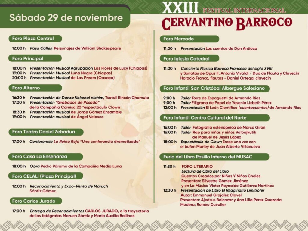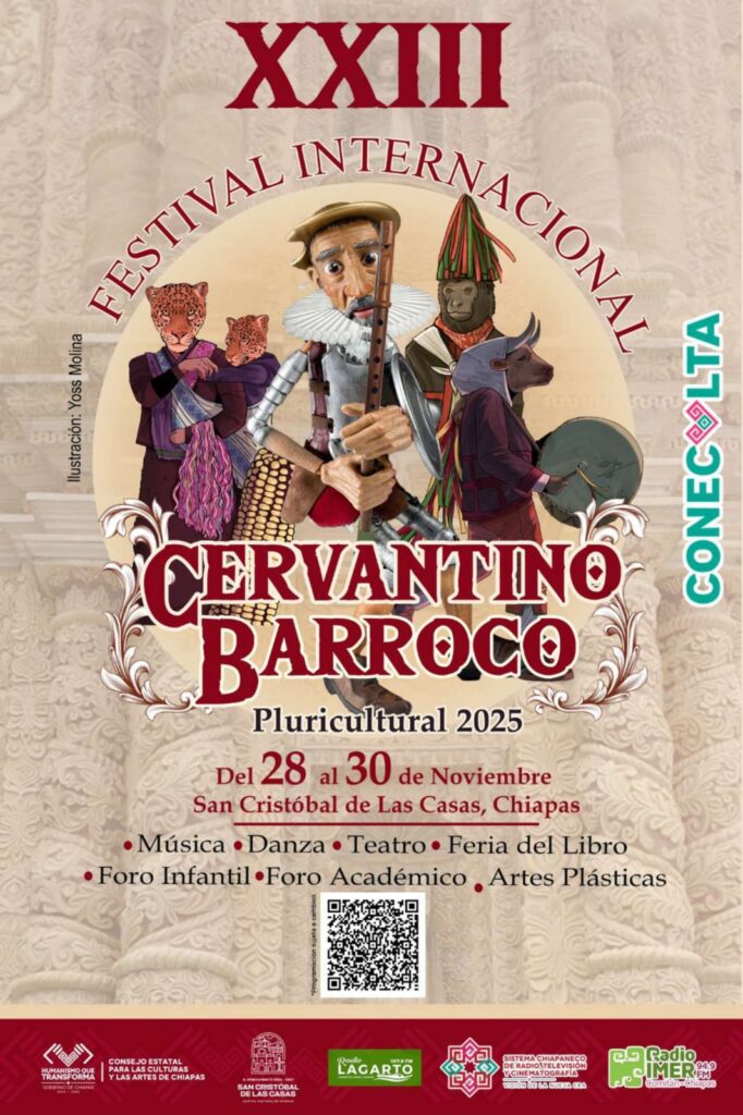 San Cristóbal de Las Casas, 18 de noviembre de 2025.- Del 28 al 30 de noviembre se llevará a cabo el XXIII Festival Cervantino Barroco Pluricultural 2025, que reunirá música, danza, teatro, feria del libro, fotografía, actividades académicas y artes plásticas, entre otras expresiones artísticas. El evento es organizado por el Consejo Estatal para las Culturas y las Artes de Chiapas (Coneculta) y el Honorable Ayuntamiento de San Cristóbal de Las Casas, presidido por la Mtra. Fabiola Ricci Diestel.