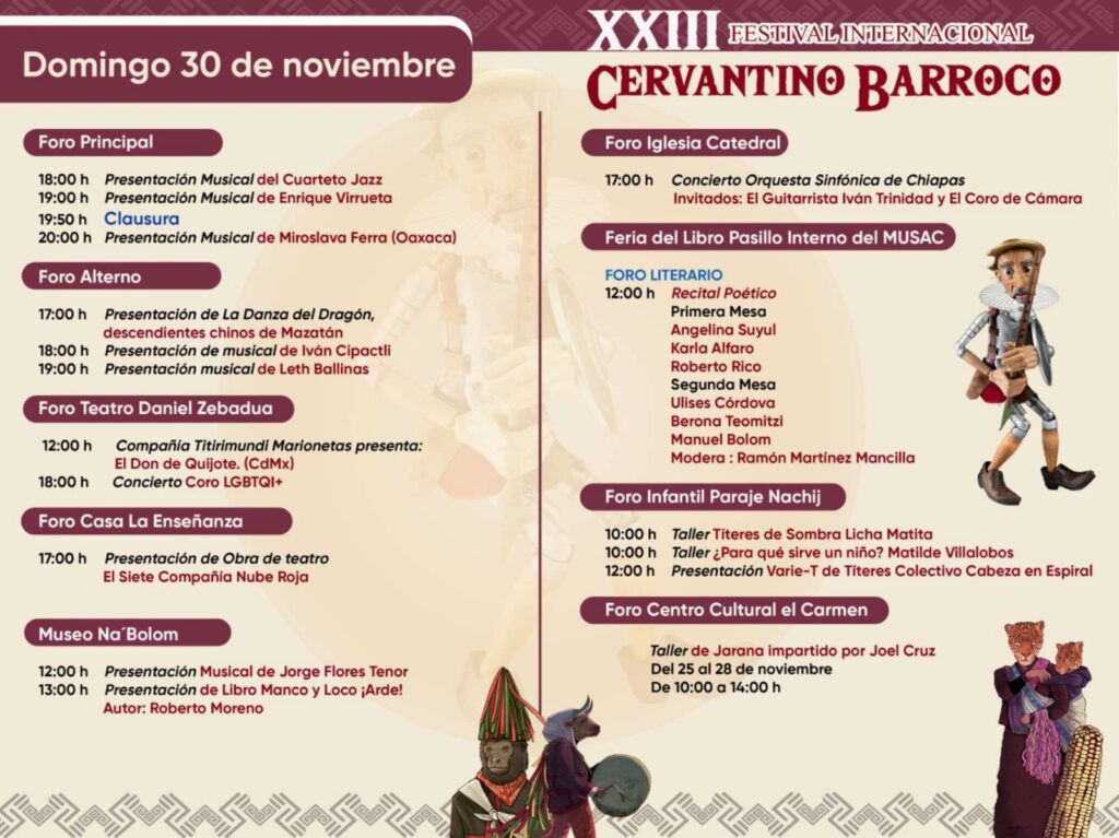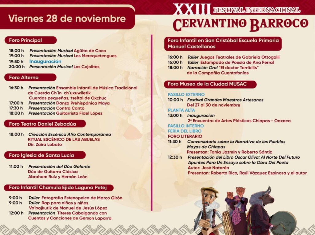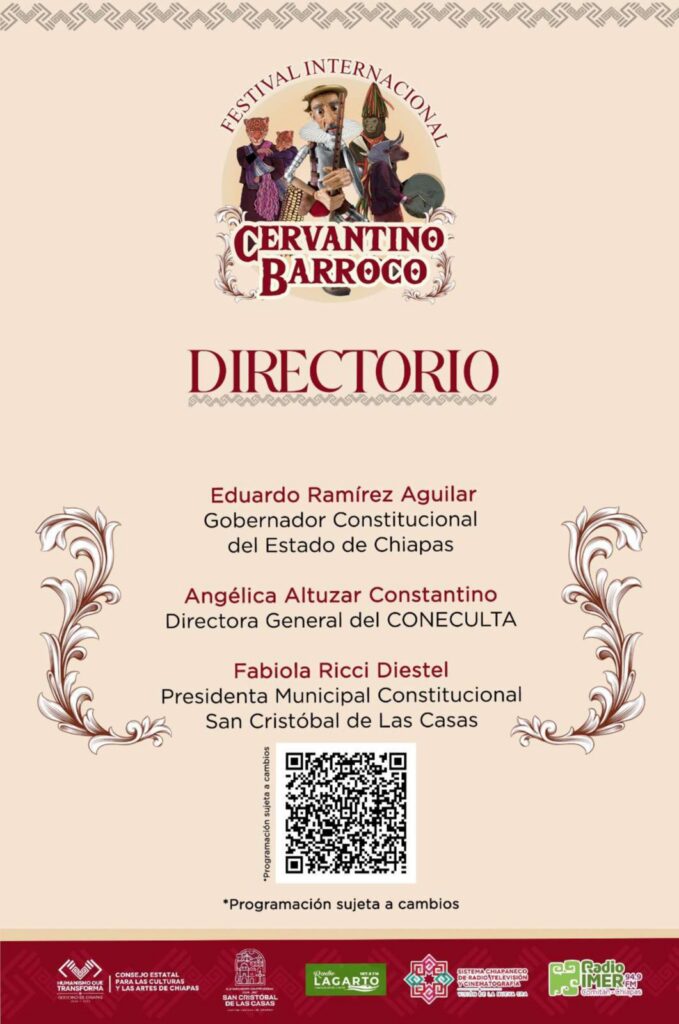 El funcionario informó que el festival contará con doce sedes, incluidos municipios cercanos como Zinacantán y Nuevo Rincón Chamula, con el propósito de ampliar su alcance cultural. También se sumarán expresiones artísticas de Oaxaca, la danza del dragón chino, agrupaciones regionales, compañías de teatro de marionetas y artistas emergentes. El Coneculta reiteró que el Cervantino Barroco celebra la diversidad, fortalece la identidad cultural y promueve la convivencia familiar en un ambiente seguro. El cierre estará a cargo de la joven artista oaxaqueña Miroslava Ferra, reconocida por su propuesta escénica inspirada en la Guelaguetza.