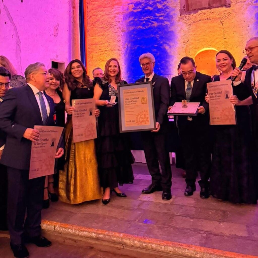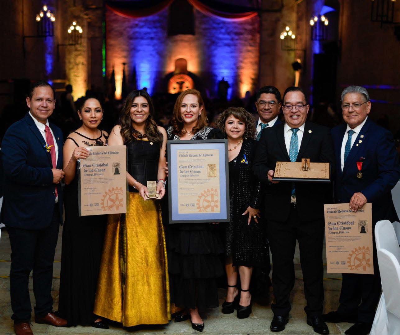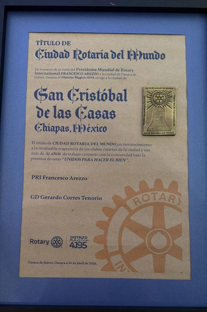 Oaxaca de Juárez, 25 de abril de 2026.— La presidenta municipal de San Cristóbal de Las Casas, Chiapas, Mtra. Fabiola Ricci Diestel, recibió en la ciudad de Oaxaca, de manos de Francesco Arezzo, presidente mundial de Rotary International, la declaratoria que reconoce al municipio como Ciudad Rotaria del Mundo, un hecho histórico que resalta más de cinco décadas de labor rotaria en la región.