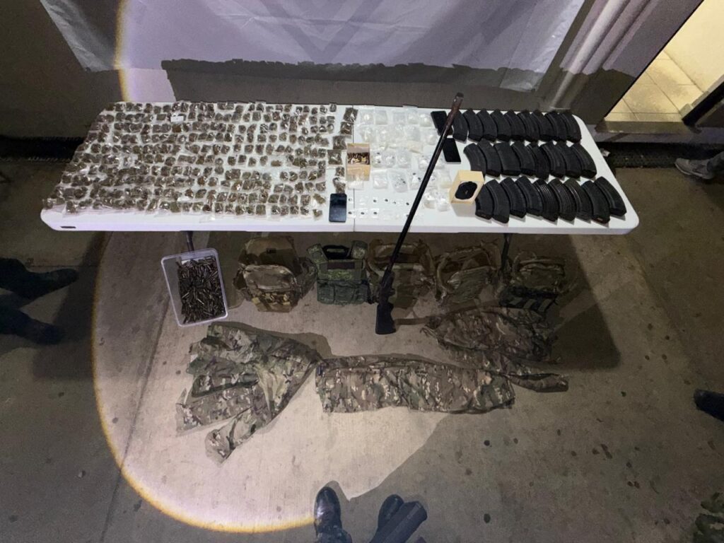 Durante el operativo fueron asegurados 600 envoltorios con sustancia granulada con características de cristal y 257 envoltorios con hierba verde con características de marihuana. Asimismo, se decomisó una escopeta hechiza calibre 9 milímetros, 26 cargadores para arma tipo fusil, 695 cartuchos útiles calibre 7.62 y 34 cartuchos útiles calibre 9 milímetros, además de cinco chalecos balísticos, un uniforme táctico y una guerrera tipo militar.