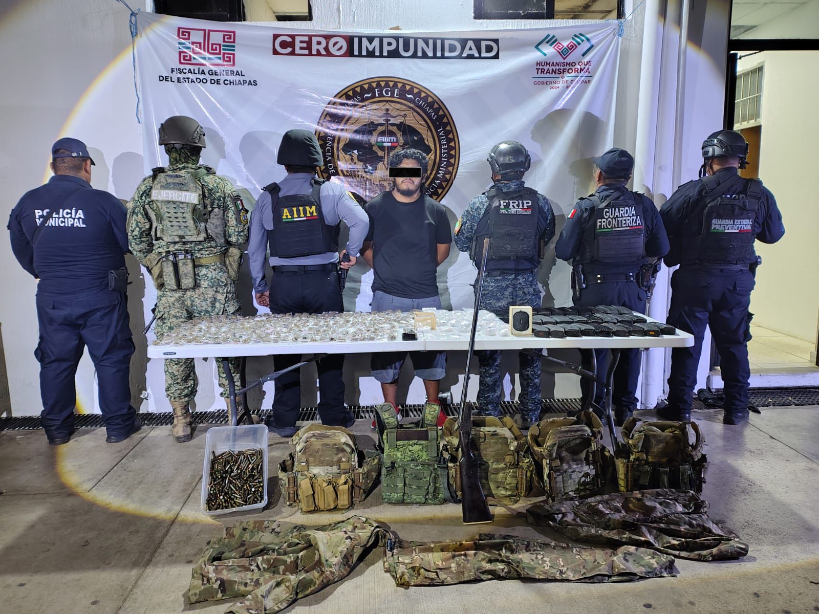 Tapachula, Chiapas a 03 de marzo del 2026.- Tapachula no da un paso atrás en la defensa de la tranquilidad de sus familias. Como parte de la respuesta del Operativo Huacali, este 3 de marzo, en la 3ª Oriente entre Privada 17 Norte, la Secretaría de Seguridad del Pueblo, a través de la Fuerza de Reacción Inmediata Pakal (FRIP) y en coordinación con la Agencia de Investigación e Inteligencia Ministerial, la Guardia Estatal Fronteriza, la Guardia Estatal Preventiva y la Policía Municipal, logró la detención en flagrancia de Jonathan “N”, de 28 años de edad, originario de Tapachula, por su presunta responsabilidad en la violación a la Ley Federal de Armas de Fuego y Explosivos y delitos contra la salud.