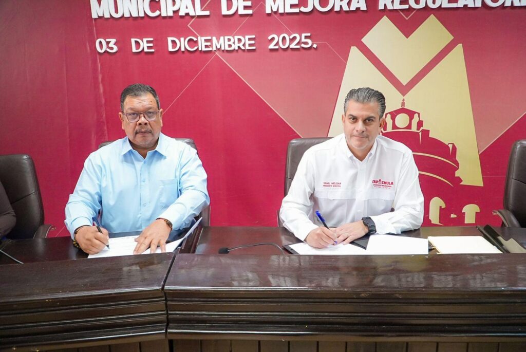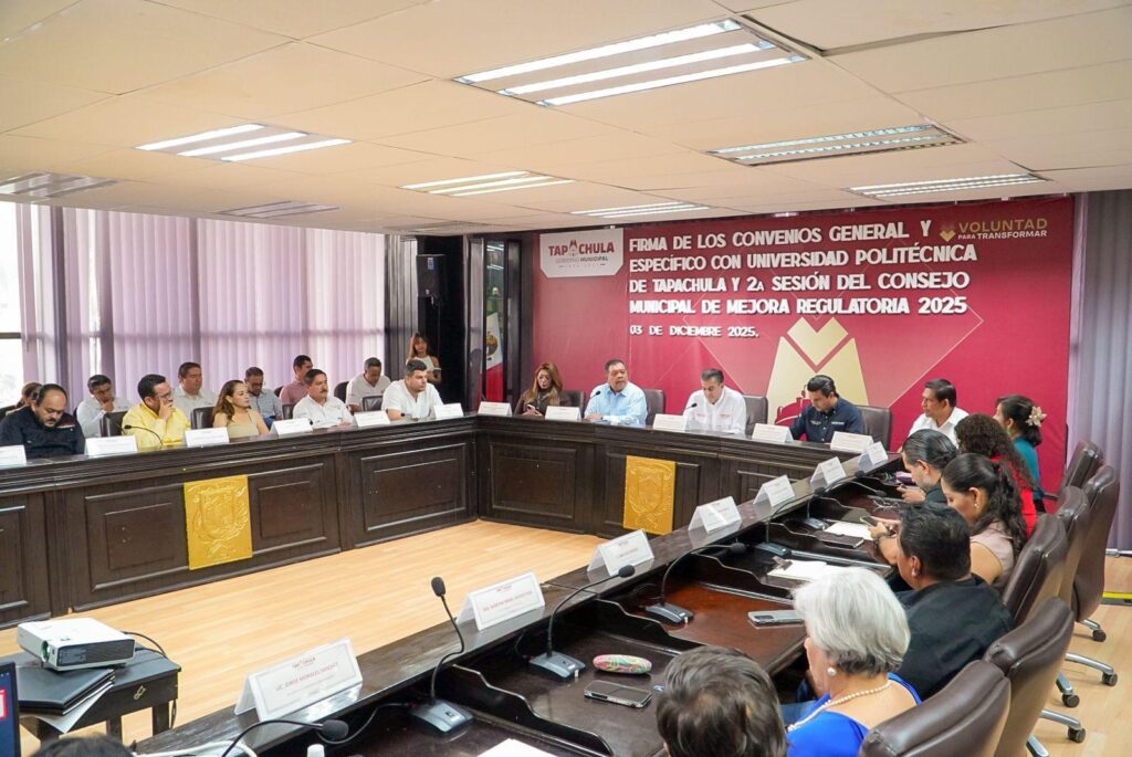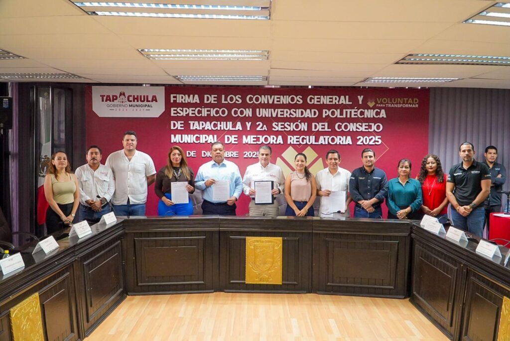 03 de diciembre de 2025, Tapachula, Chiapas.– El Ayuntamiento de Tapachula y la Universidad Politécnica de Tapachula (UPTAP) llevaron a cabo la firma del convenio general y del convenio específico, consolidando una alianza estratégica que marca un antes y un después para el desarrollo del municipio, al impulsar la modernización y digitalización de trámites conforme a la Ley Nacional para Eliminar Trámites Burocráticos.