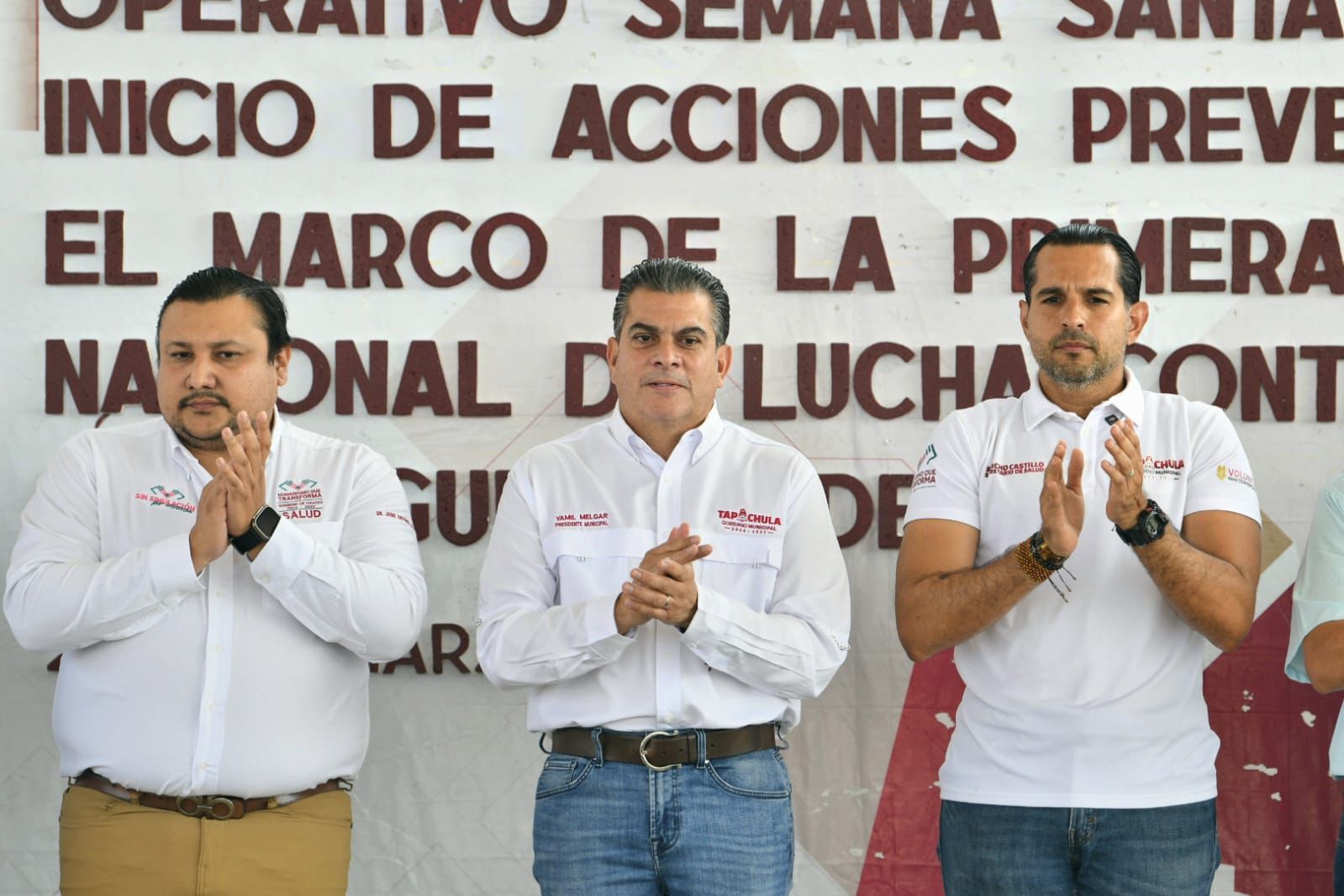En Puerto Madero, el presidente municipal, Yamil Melgar Bravo, encabezó el inicio del Operativo Semana Santa 2026, en el marco de la Jornada Nacional de la Lucha contra el Dengue y la Chikungunya, destacando el trabajo conjunto con la Jurisdicción Sanitaria VII para disminuir riesgos por enfermedades transmitidas por vector.