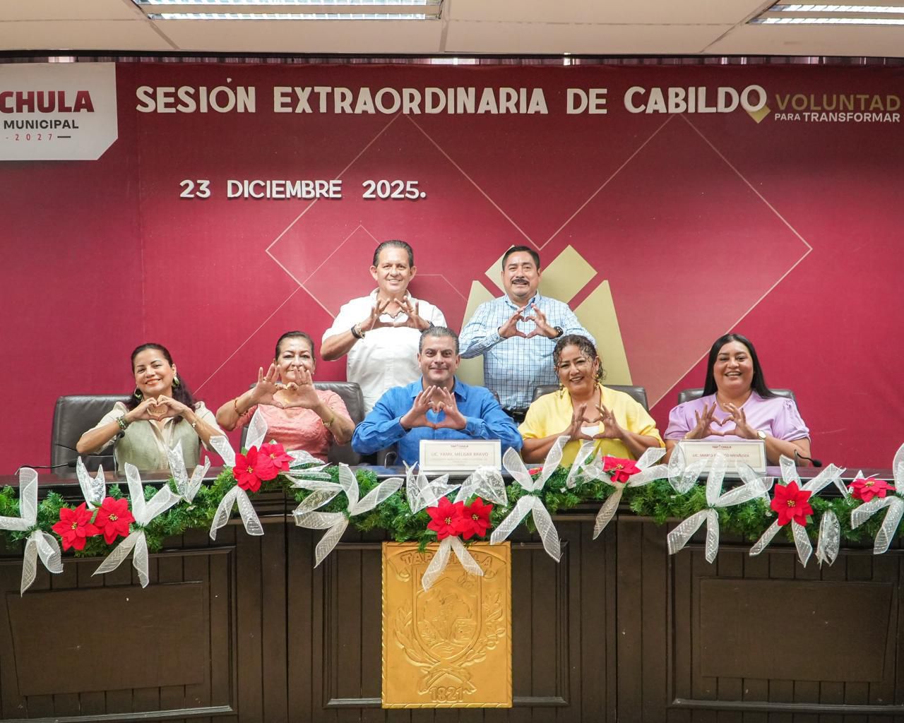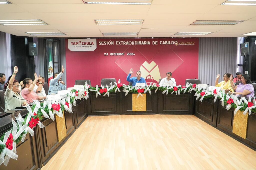Tapachula, Chiapas; 23 de diciembre de 2025.- En Sesión Extraordinaria de Cabildo, el presidente municipal Yamil Melgar, acompañado de las y los integrantes del Cabildo del H. Ayuntamiento de Tapachula, así como del Secretario General del Ayuntamiento, Mario Orozco, enviaron una felicitación a todas y todos los habitantes del municipio con motivo de las fiestas decembrinas.