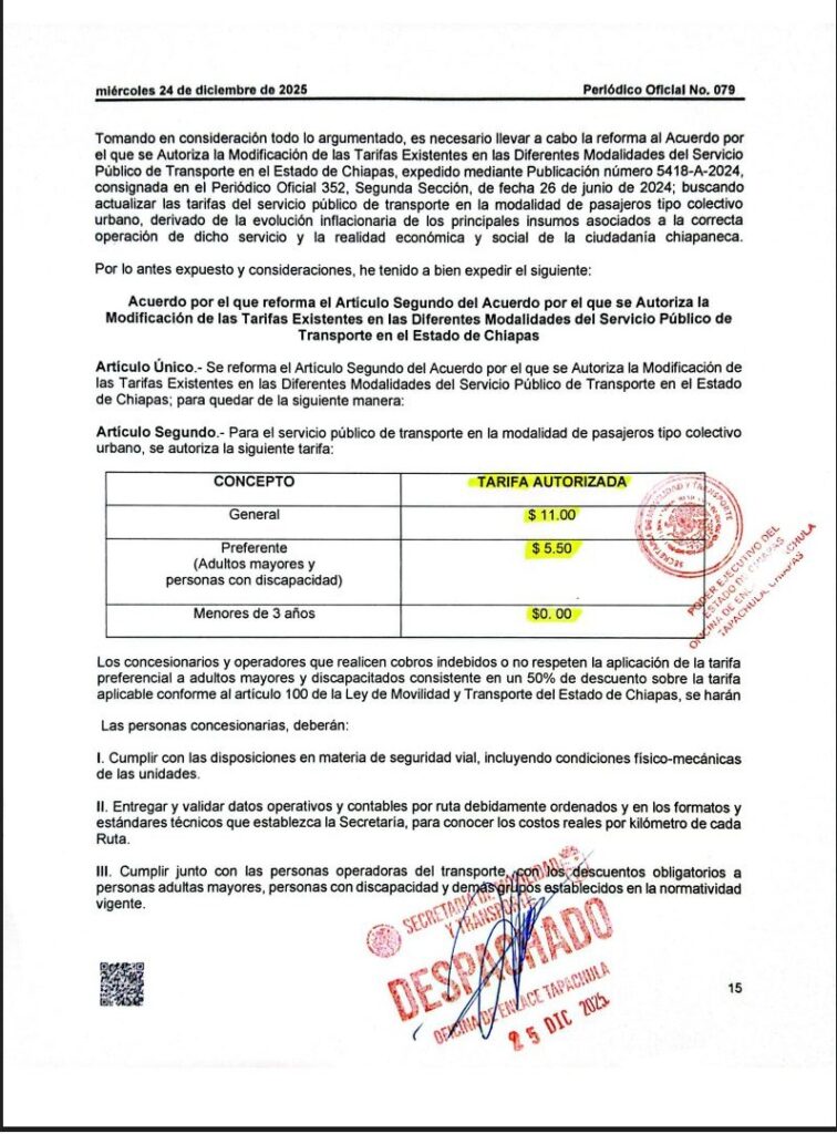 Asimismo, el documento expone que concesionarios y operadores que realicen cobros indebidos o no respeten la aplicación de la tarifa preferencial a adultos mayores y discapacitados consistente en un 50% de descuento sobre la tarifa aplicable conforme al artículo 100 de la Ley de Movilidad y Transporte del Estado de Chiapas, se harán acreedores a las sanciones que establece la Ley de la materia.