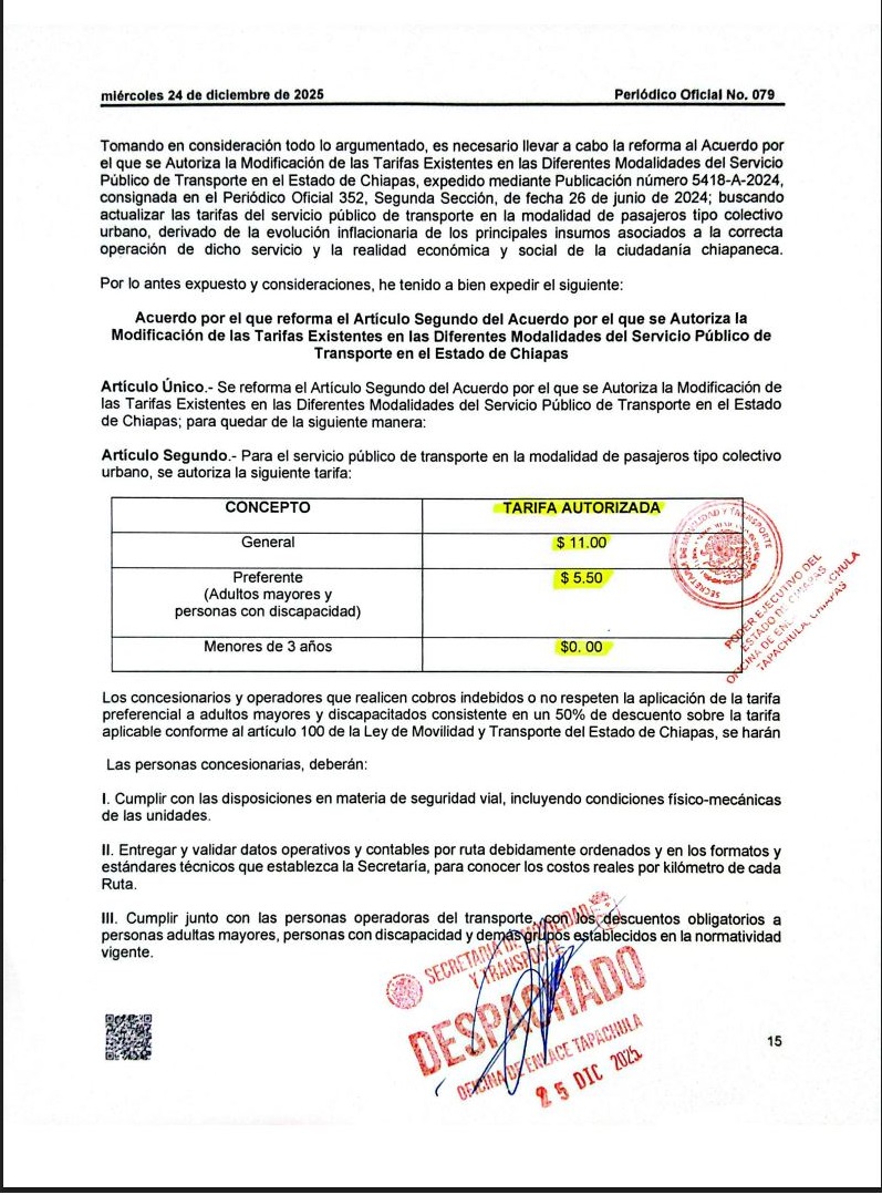 Ante la controversia que se ha suscitado en torno al incremento de pasaje en colectivos urbanos en Tapachula, choferes y concesionarios señalaron que la nueva tarifa es oficial de acuerdo con publicación del 24 de diciembre del 2025 en el periódico oficial que establece que de manera general será de 11:00 pesos la corrida mientras que el preferente para adultos mayores y personas con discapacidad es de 5:50 pesos mientras que los niños menores de 3 años no pagarán pasaje.