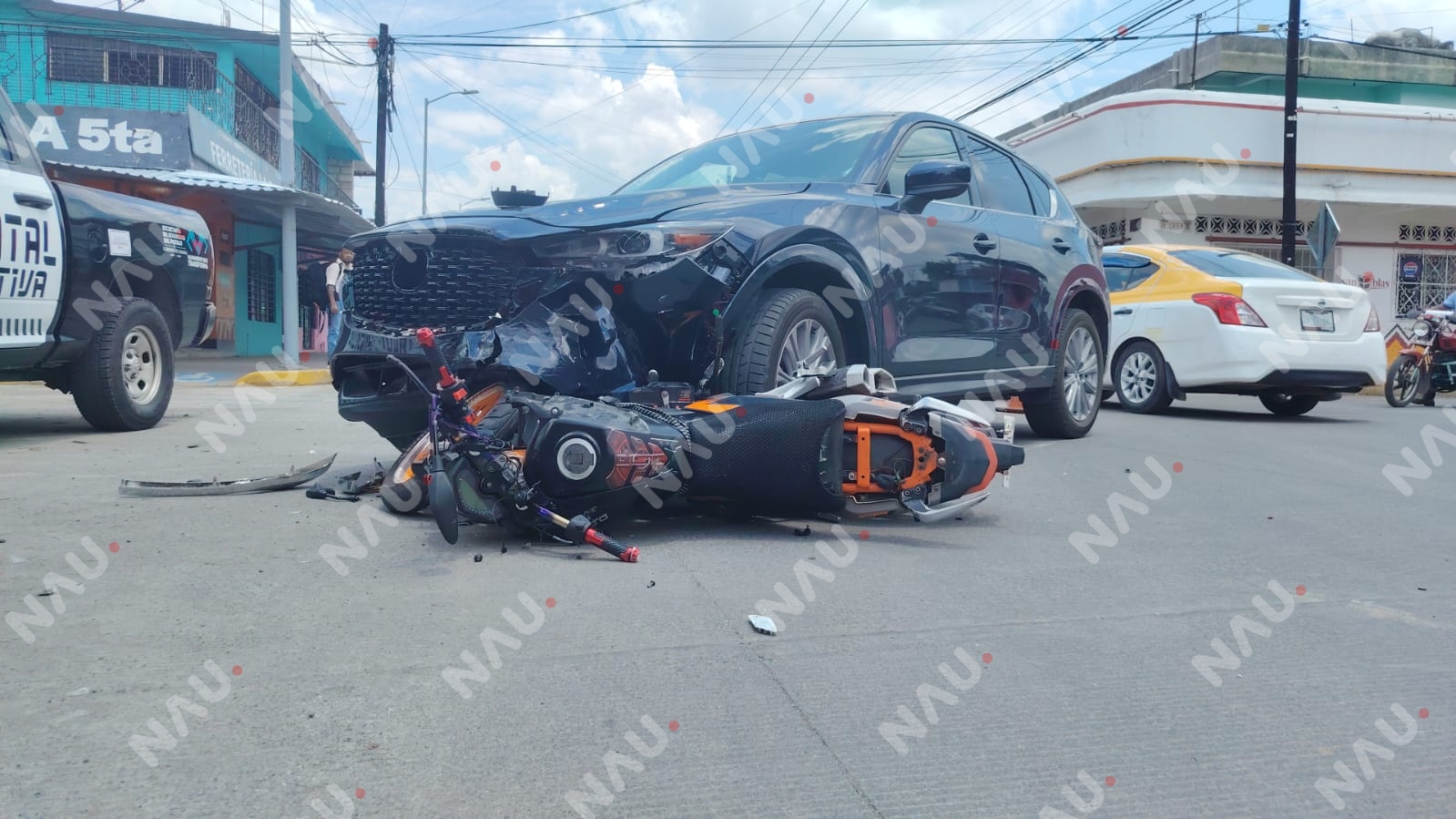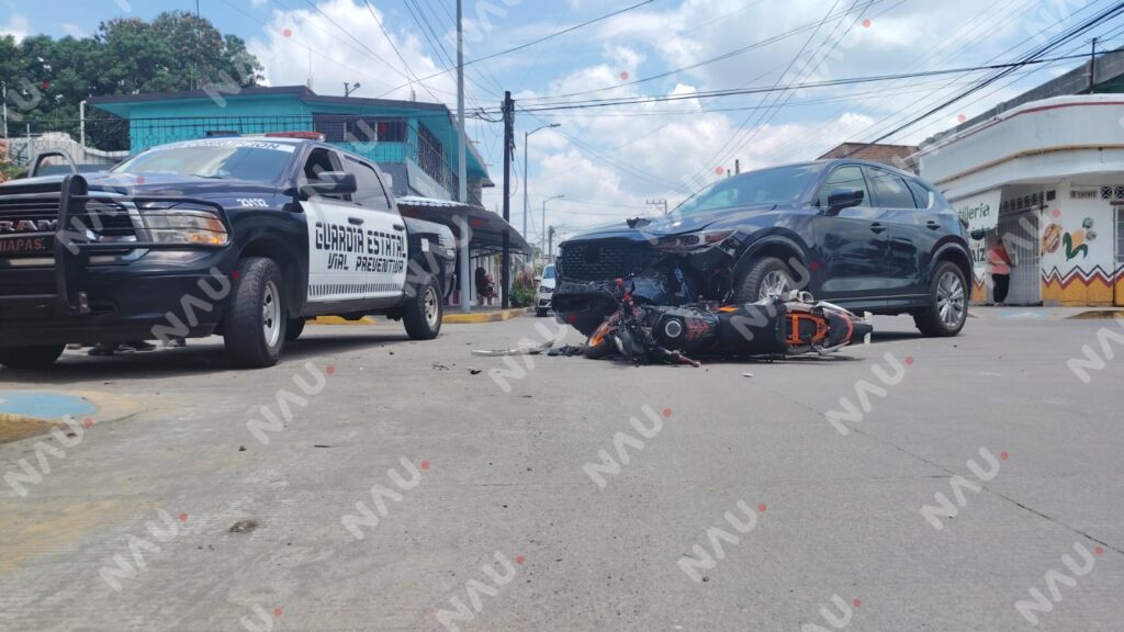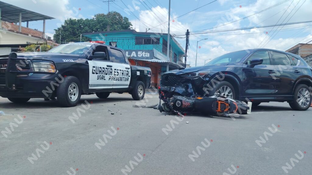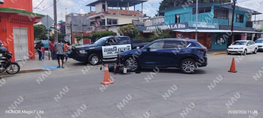 El incidente se registró cerca de las 11:30 horas en la intersección de la 5ª Avenida Sur y 18 Calle Oriente, donde, de acuerdo con los primeros reportes, una de las unidades habría interrumpido la circulación preferente, lo que derivó en la colisión. Tras el impacto, el conductor de la motocicleta quedó sobre el pavimento con visibles lesiones.