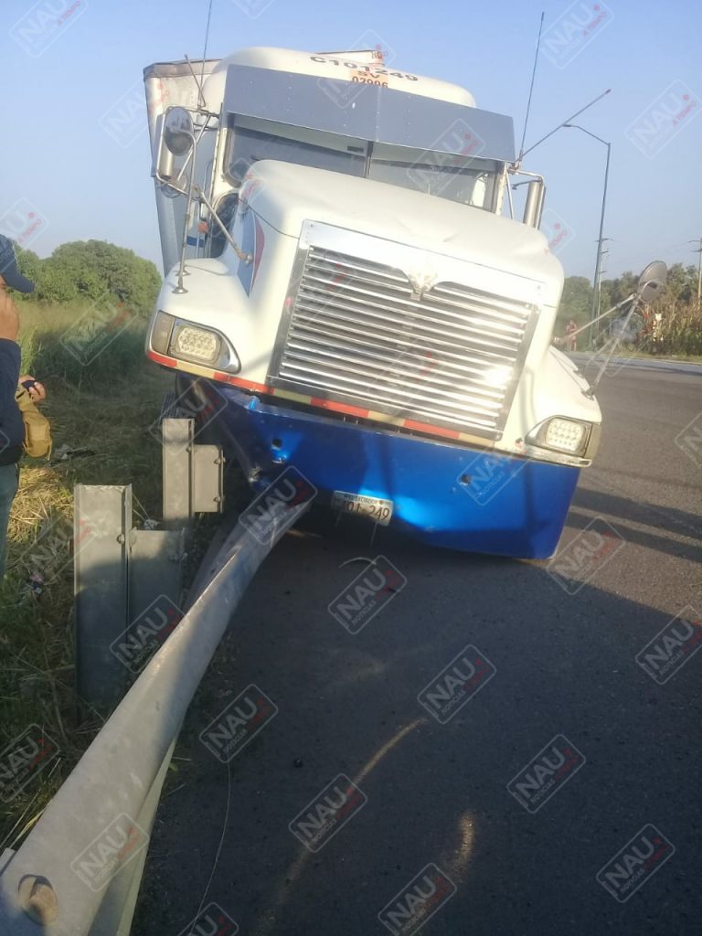 El tráiler había chocado contra el muro de contención, mismo que jalaba una caja seca de color blanca con razón social grupo Golán, el cual se encuentra sobre la barra metálica a la orilla de la carretera.