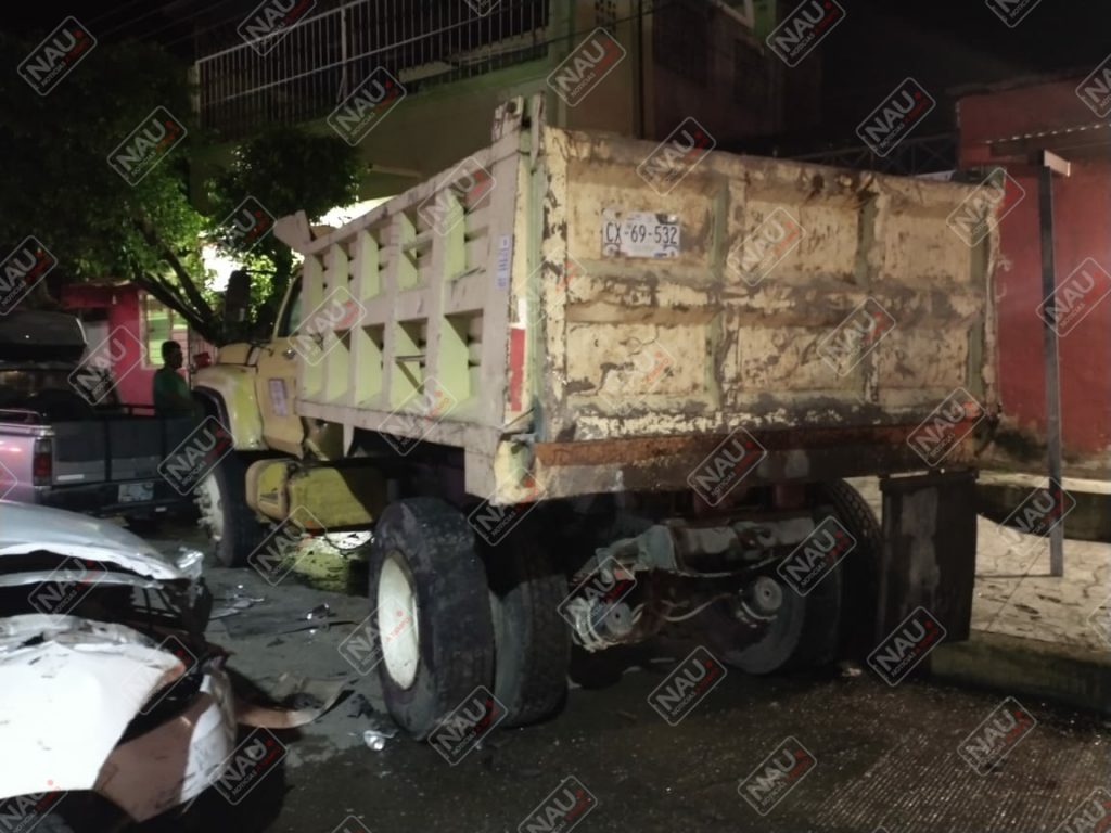 Abandonan vehículo tras chocar con un camión de volteo estacionado