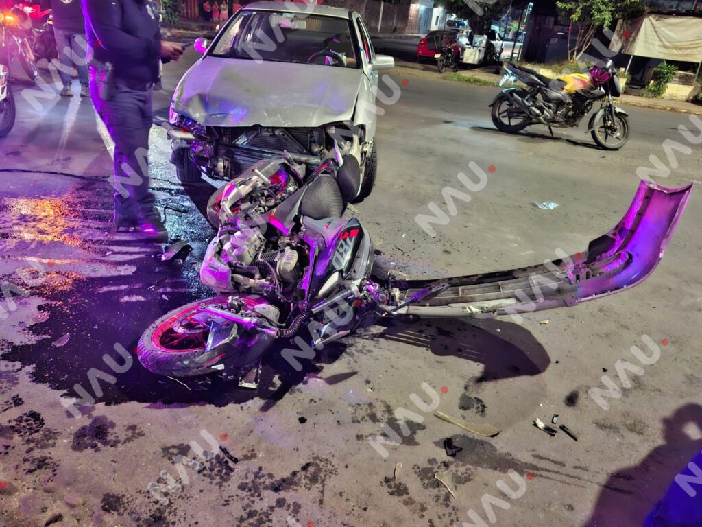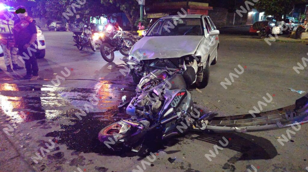 Tapachula, Chiapas.— Un accidente vehicular registrado la noche del sábado en la zona norte-poniente de la ciudad, dejó como saldo una persona lesionada y daños materiales en tres unidades, entre ellas una motocicleta, un taxi del servicio público y un vehículo particular.