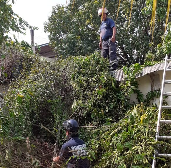 TAPACHULA, CHIAPAS. LA mañana de este lunes el cuerpo de Bomberos de Tapachula recibió una llamada de auxilio de una familia de la Colonia Colinas del Rey al norte de #Tapachula, reportaban la caída de un árbol sobre la vivienda, los elementos a cargo del comandante Iván Estrada Rosales, con equipo comenzaron los trabajos de remoción de las ramas, de acuerdo al reporte de los bomberos, las constantes lluvias y vientos al norte de la ciudad es lo que habría provocado que el árbol cayera sobre la casa, afortunadamente no hubieron personas heridas solo daños materiales.