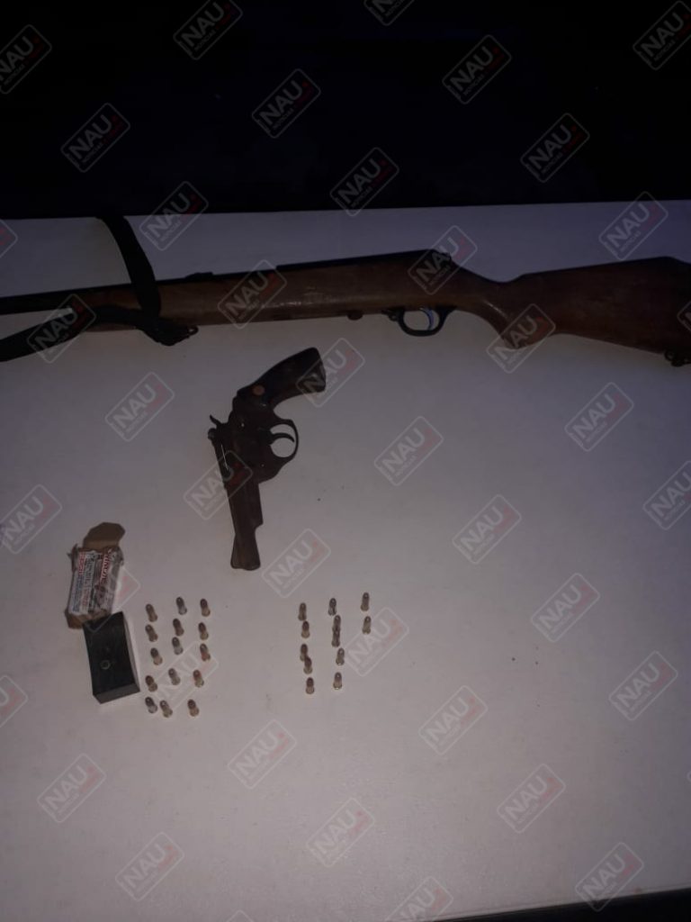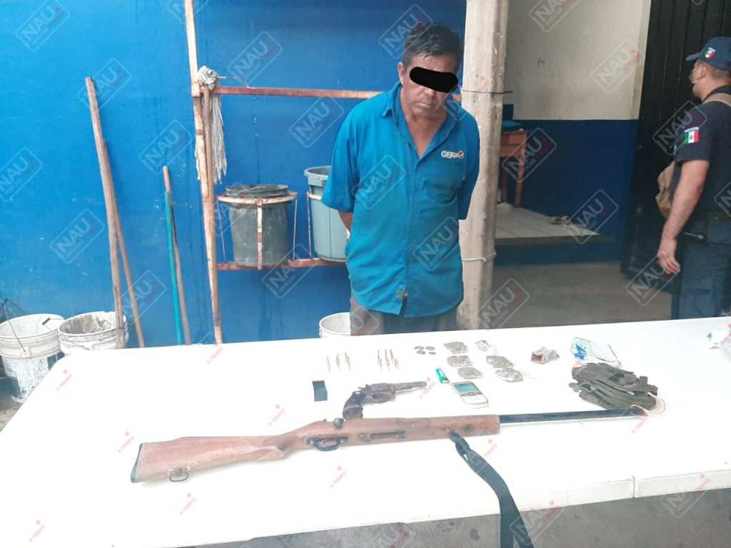 Al momento de que intentó darse a la fuga fue asegurado, dijo llamarse Heraldo N. de 43 años de edad, al aplicarle una revisión se le encontró en estado de ebriedad y se le aseguró 6 bolsitas de marihuana, una pistola color negro tipo revólver calibre 22, marca ilegible, con 27 cartuchos útiles, un rifle del calibre 22 con cacha de madera con capacidad de un solo cartucho.