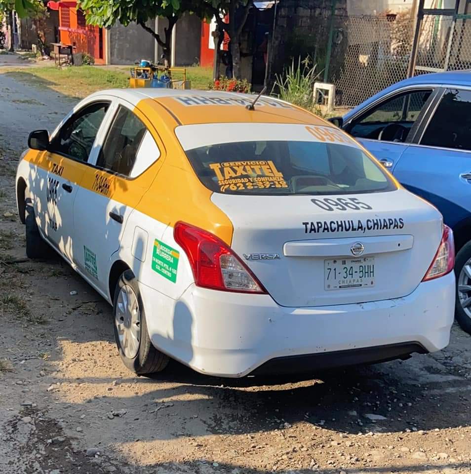 Durante patrullajes de vigilancia y seguridad, los elementos de la SSyPC localizaron el vehículo marca Nissan tipo Versa de color blanco con franja amarilla en su modalidad de taxi, con número económico 0965 y placas 71-34-BHH del Estado de Chiapas.