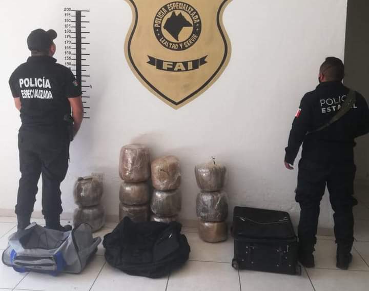 En su interior fueron halladas tres maletas con 11 paquetes confeccionados con cinta canela que contenían hierba seca con las características de la marihuana, con un peso total aproximado de 35 kilos, mismos que fueron puestos a disposición del Ministerio Público junto con el vehículo.
