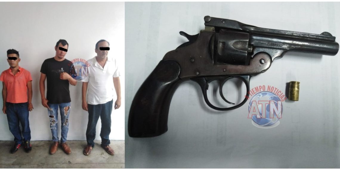 Al aplicarles una revisión a una de las personas, encontraron a la altura de la cintura del lado derecho, un arma tipo revolver calibre 32 y un casco percutido, y a las dos personas más se le encontró a cada uno en la bolsa del pantalón, dos bolsitas de nailon transparente conteniendo en su interior Polvo granulado con las características del (cristal).