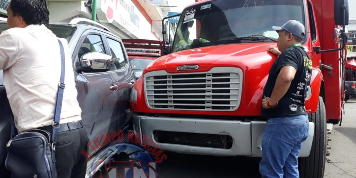 TAPACHULA, CHIAPAS. – Un camión repartidor de cerveza, impactó a una camioneta estacionada sobre la 14a privada avenida norte y 11a calle poniente; explanada del mercado San Juan.