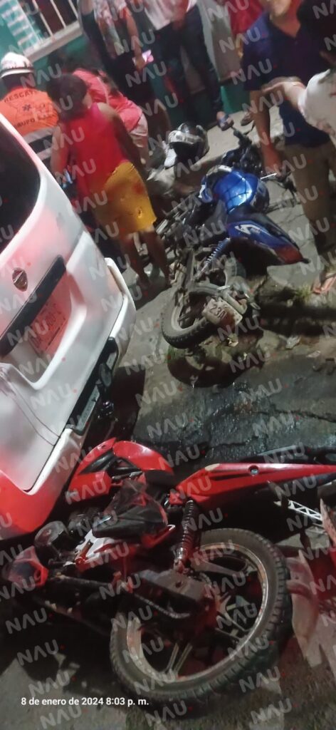 Tapachula, Chiapas. Un motociclista lesionado dejó como saldo el choque de dos motocicletas, sobre la carretera Tapachula al ejido 20 de Noviembre, quienes se impactaron contra un combi de color blanco, marca Nissan, a la altura del salón de fiestas de la colonia el Vergel.