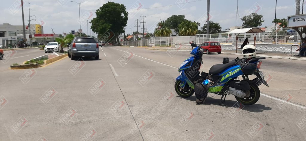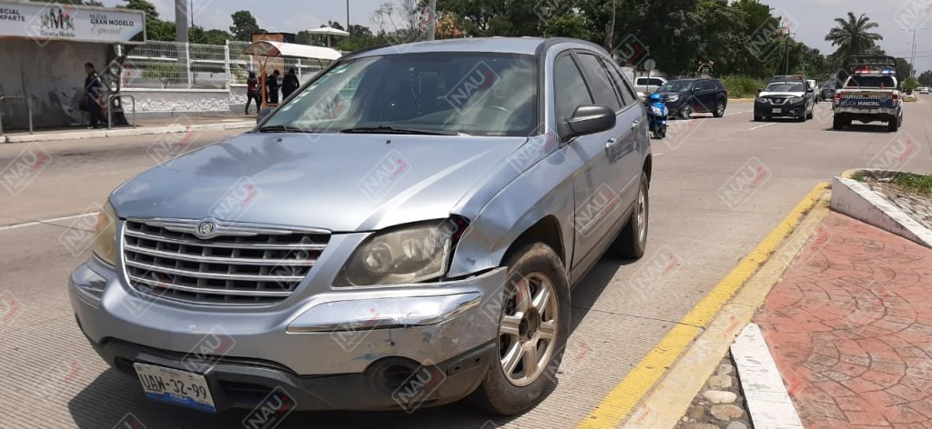 El percance se registró alrededor de las 12:20 horas de este lunes, cuando una camioneta tipo familiar Chrysler tipo pacífica, de color celeste, salía del estacionamiento de Walmart e intentó incorporarse a la 4ª avenida sur.