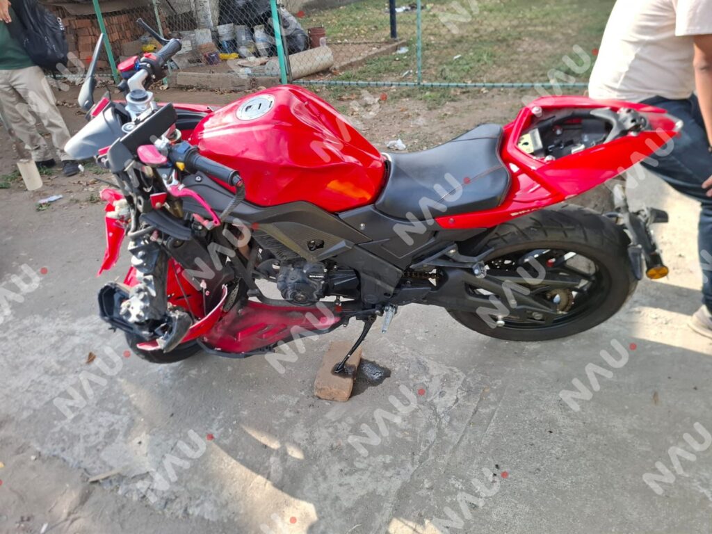 Según versiones recabadas en el lugar, una motocicleta de color rojo en la que viajaban dos hombres circulaba de norte a sur sobre el Boulevard Akishino, presuntamente con vía preferencial. Sin embargo, el conductor de una camioneta que salía de una calle adjunta no habría tomado las debidas precauciones al incorporarse, realizando corte de circulación a los motoristas.