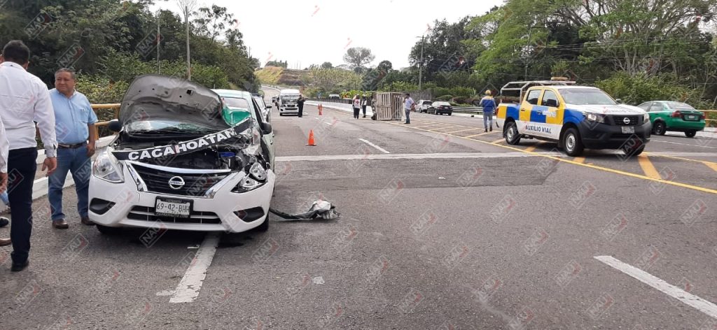Metros atrás estaba un vehículo Nissan tipo Estaquita de color blanco, el cual estaba volcado en su costado derecho y presentaba daños en la parte de atrás, sobre los hechos se supo que ambos vehículos se desplazaban de Tuxtla Chico hacia Tapachula, pero al llegar a la altura del puente Cahoacan, la camioneta tipo Estaquita venía según bajando su velocidad para incorporarse al entronque de la colonia San Antonio Cahoacan.