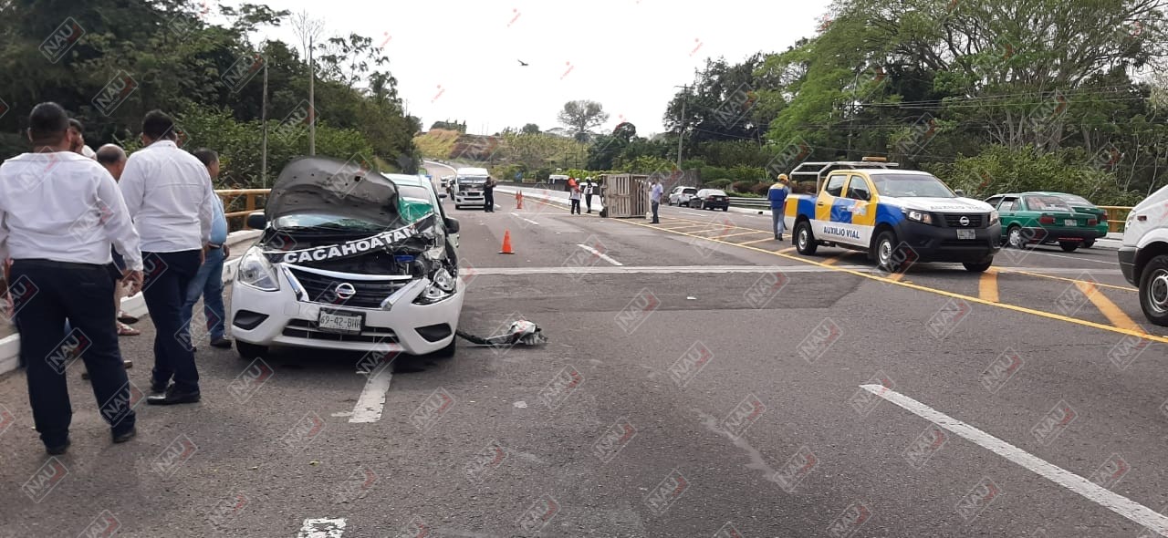 Metros atrás estaba un vehículo Nissan tipo Estaquita de color blanco, el cual estaba volcado en su costado derecho y presentaba daños en la parte de atrás, sobre los hechos se supo que ambos vehículos se desplazaban de Tuxtla Chico hacia Tapachula, pero al llegar a la altura del puente Cahoacan, la camioneta tipo Estaquita venía según bajando su velocidad para incorporarse al entronque de la colonia San Antonio Cahoacan.