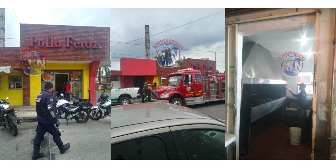 TAPACHULA, CHIAPAS. – Elementos del cuerpo bomberos y de la policía municipal y estatal, atendieron un conato de incendio en el interior de un establecimiento de pollos asados, ubicado en la 17a calle oriente y 13a avenida norte.
